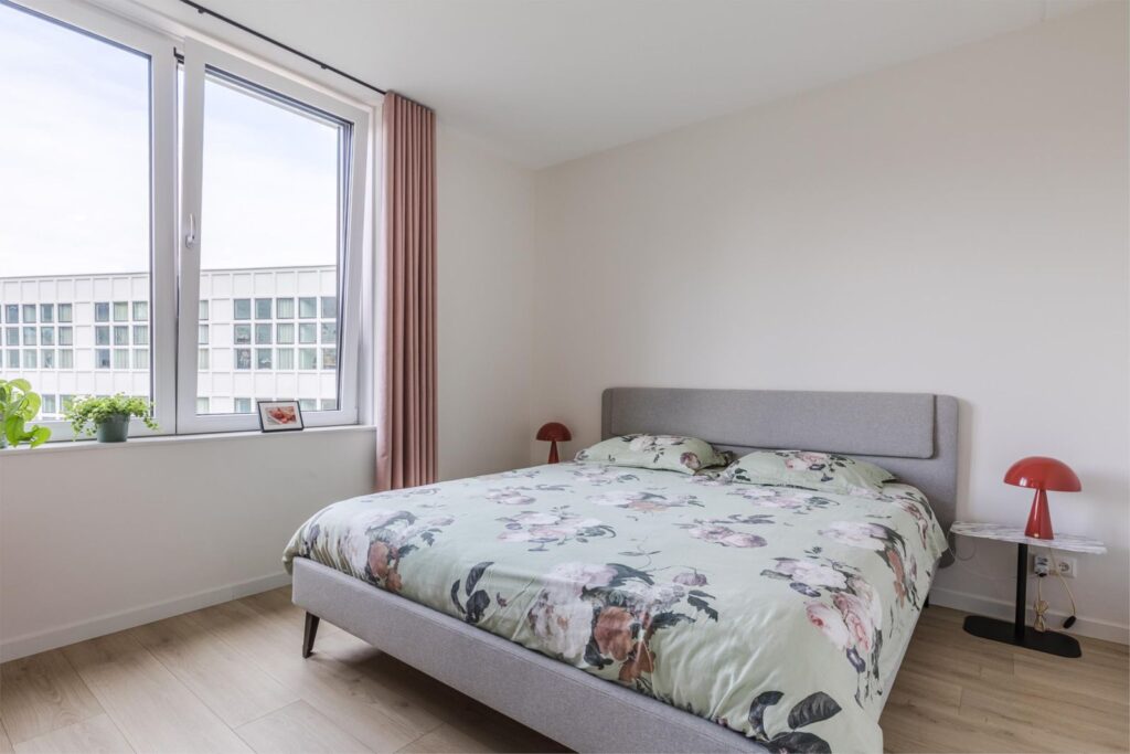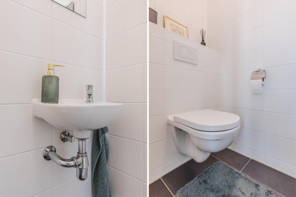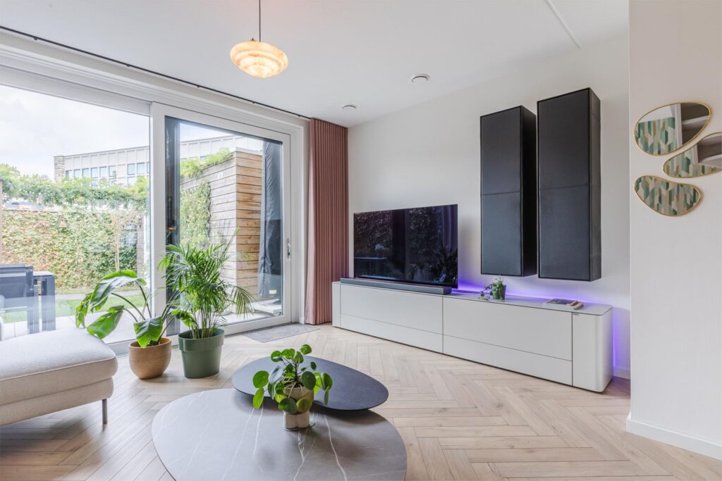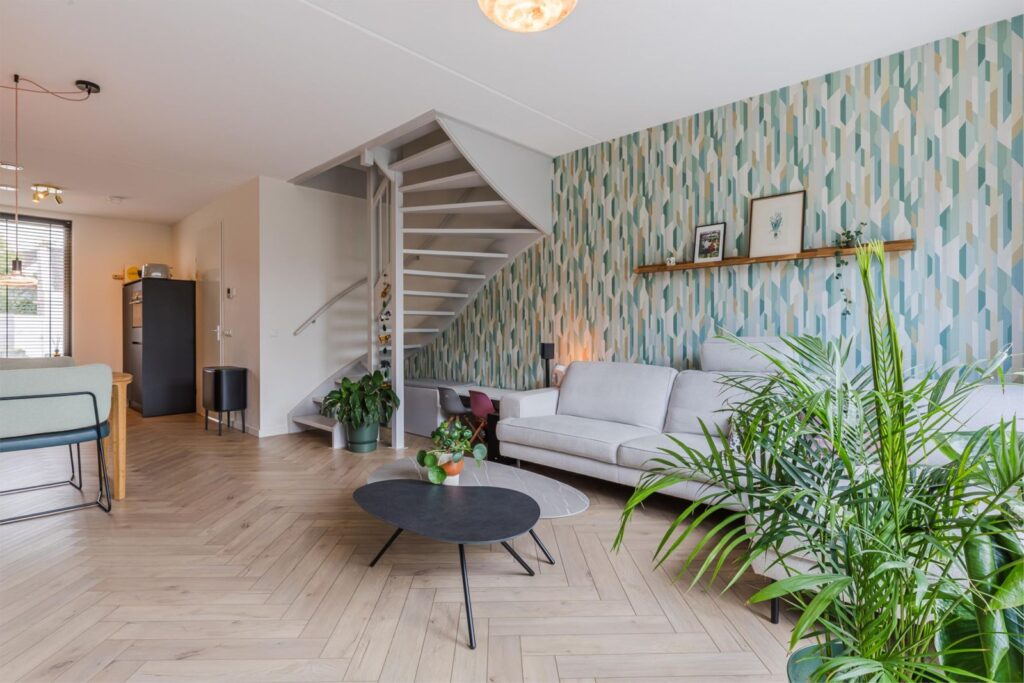 Je komt binnen in de hal, welke toegang geeft tot de meterkast en een betegeld toilet met wandcloset en fontein. Daarna loop je de woonkamer in: een stijlvolle living (36 m²) waar koken, eten en ontspannen moeiteloos in elkaar overlopen. De visgraatvloer (PVC) zorgt voor een rustige moderne basis en de grote raampartijen laten het daglicht rijkelijk binnen. Of je nu samen ontbijt aan de eettafel, borrelt met vrienden of geniet van een rustige avond op de bank. Hier voelt elke dag als thuiskomen.