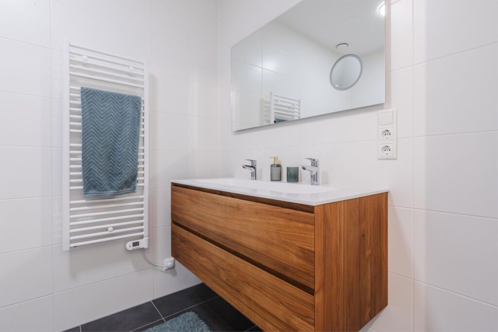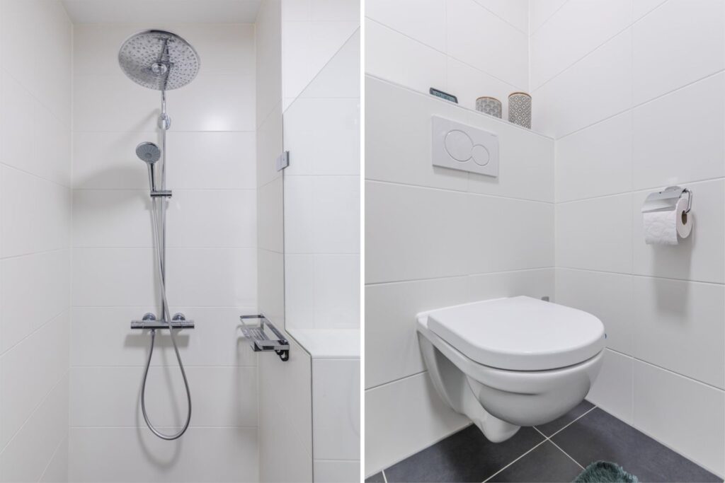 Op de eerste verdieping bevinden zich twee ruime slaapkamers (15,44 m² en 14,4m²) en een moderne badkamer. De badkamer is voorzien van een ruime douche met regendouche, een houtlook wastafelmeubel, een wandcloset en net tegelwerk.