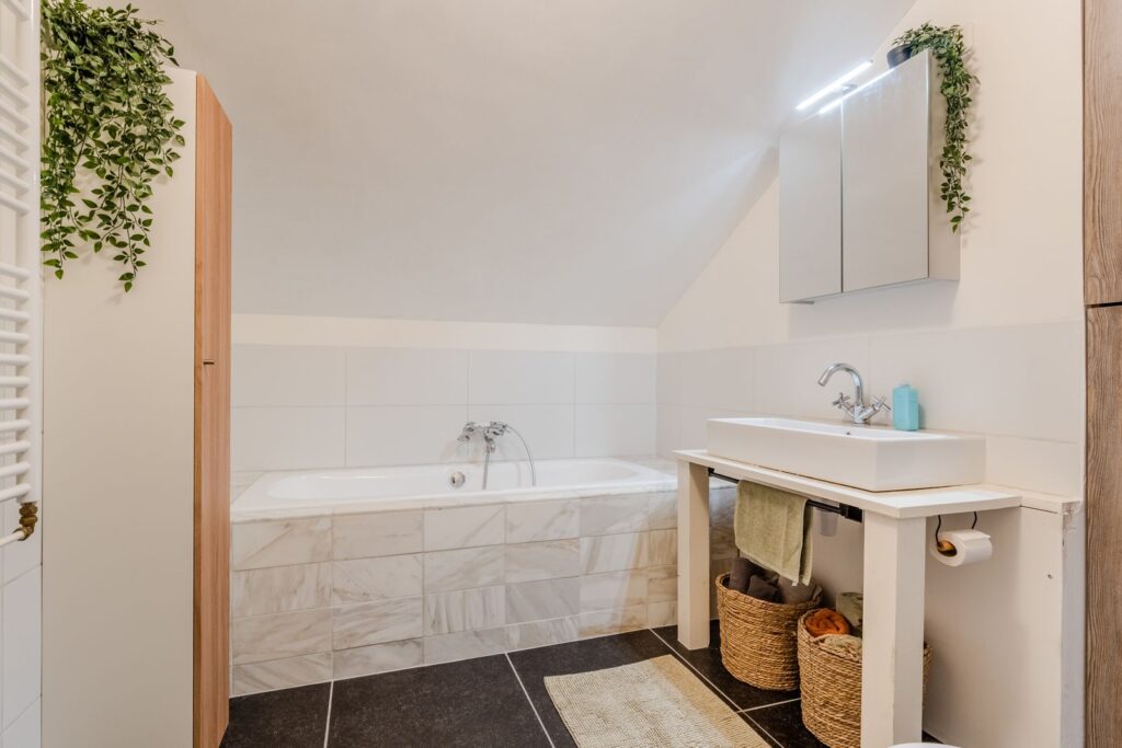 The staircase in the hallway leads to the first floor. Here you will find another large bathroom with toilet and bathtub, as well as a cupboard with connections for a washing machine and dryer. The mechanical ventilation system with humidity sensor, serving both bathrooms and the toilet, is also located here. This floor additionally offers two bedrooms, including a very large master bedroom. Sleeping under the sloped roof creates a cozy atmosphere, and there is plenty of space for wardrobes.