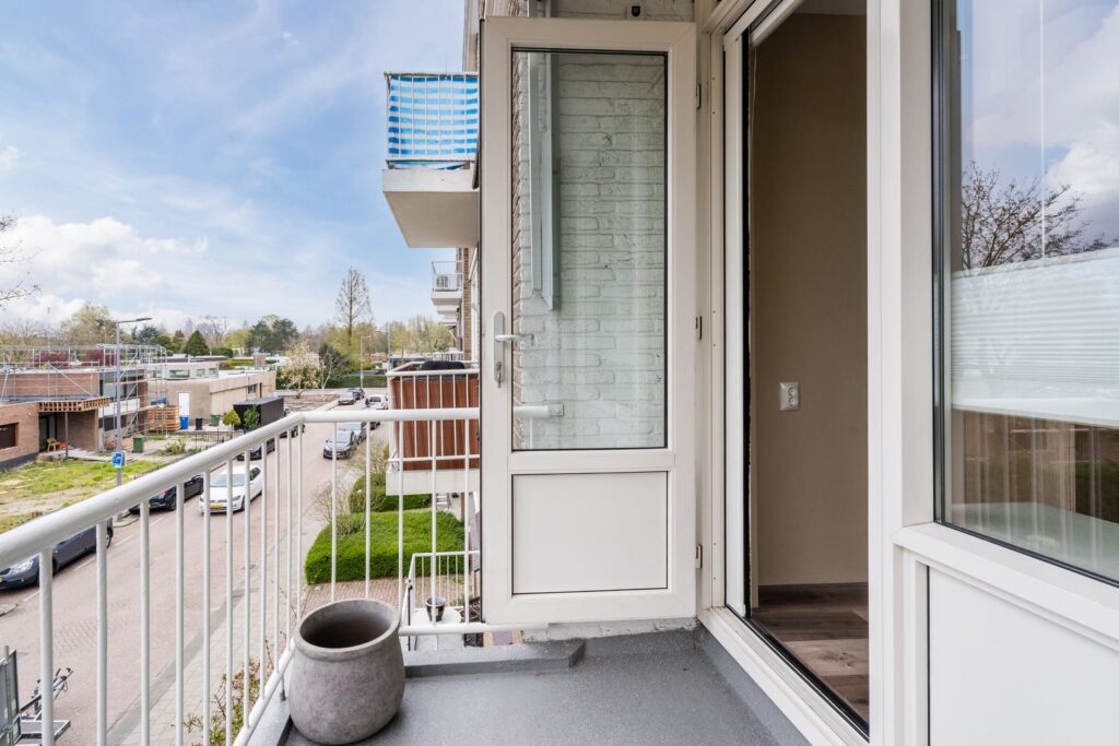 Via de openslaande deur bereik je het eerste balkon op het westen, waar je in de (na)middag en avond volop kunt genieten van de zon.