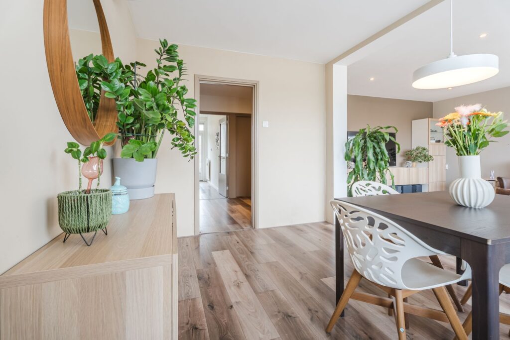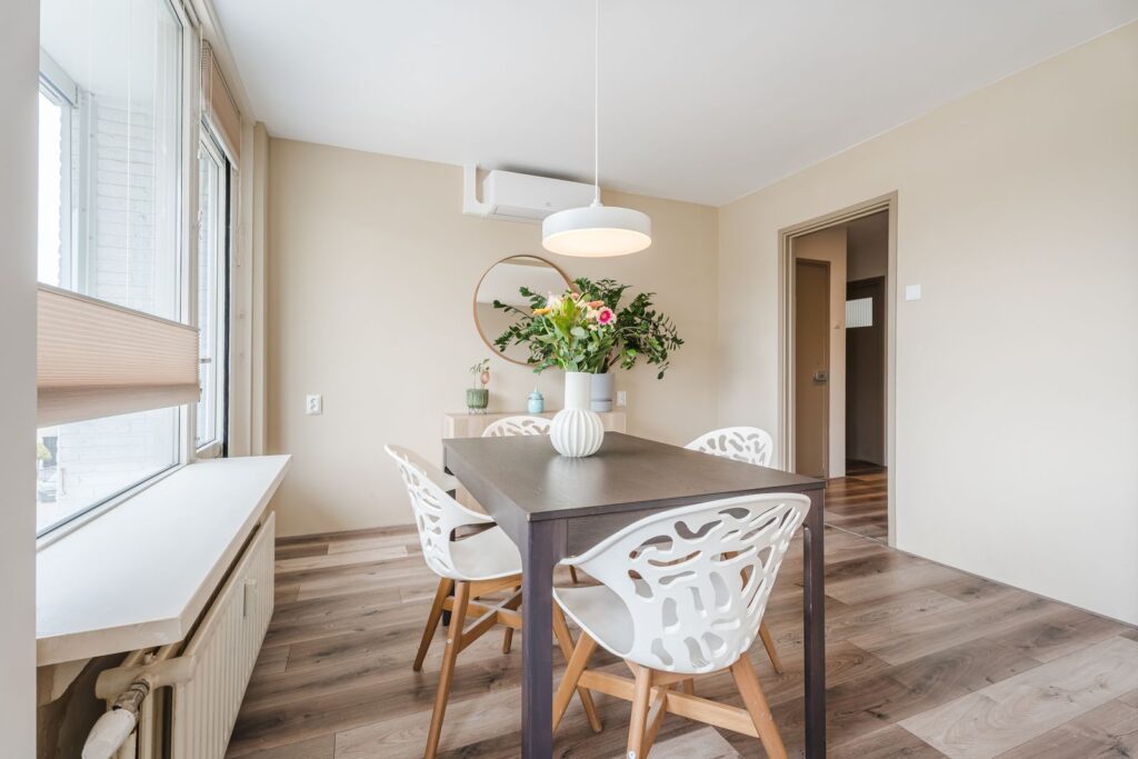 De eethoek sluit mooi aan op de woonkamer en biedt met gemak plek voor een grote eettafel. De ruimte is uitgerust met airconditioning, twee elektrische zonneschermen en plissé gordijnen (top-down/bottom-up).