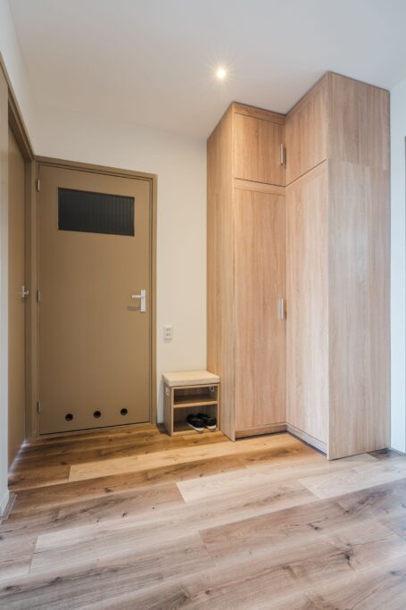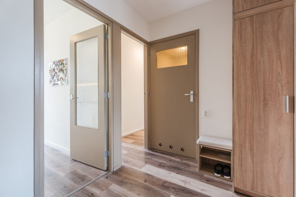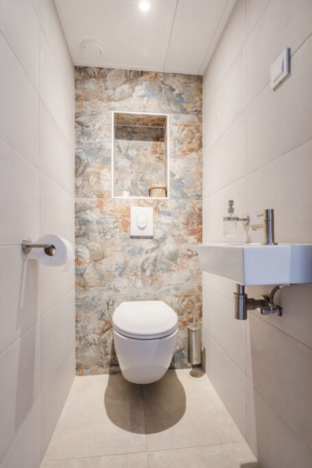 Terug in de hal vind je het mooie separate toilet (2025), de meterkast, een ruime bergkast, de kast met aansluitingen voor wasmachine en droger en de toegang tot de badkamer, keuken en drie slaapkamers.
