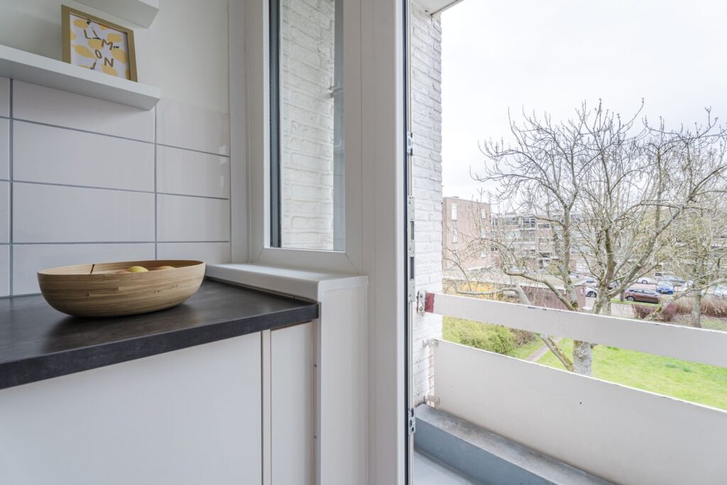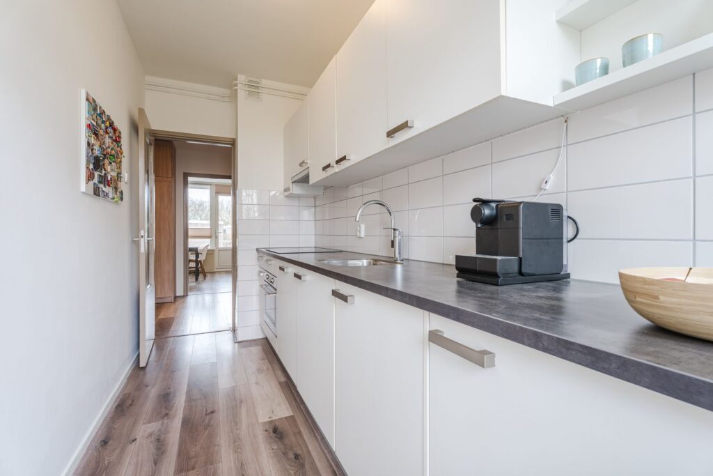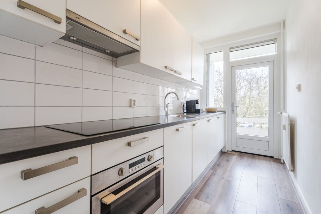 De keuken (2019), eveneens aan de achterzijde, is modern en compleet ingericht met een inductiekookplaat, afzuigkap, combi-oven, koelkast, vriezer en vaatwasser. Ook hier is volop bergruimte aanwezig. Vanuit de keuken heb je toegang tot het tweede balkon op het oosten, perfect voor een eerste kopje koffie en/of rustig ontbijtje in de ochtendzon.