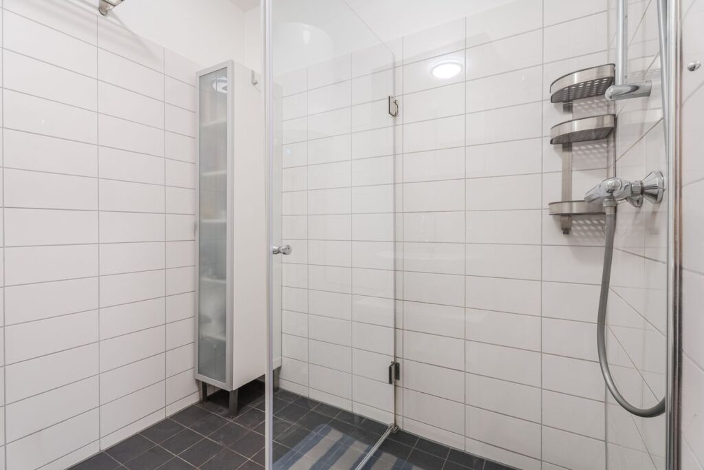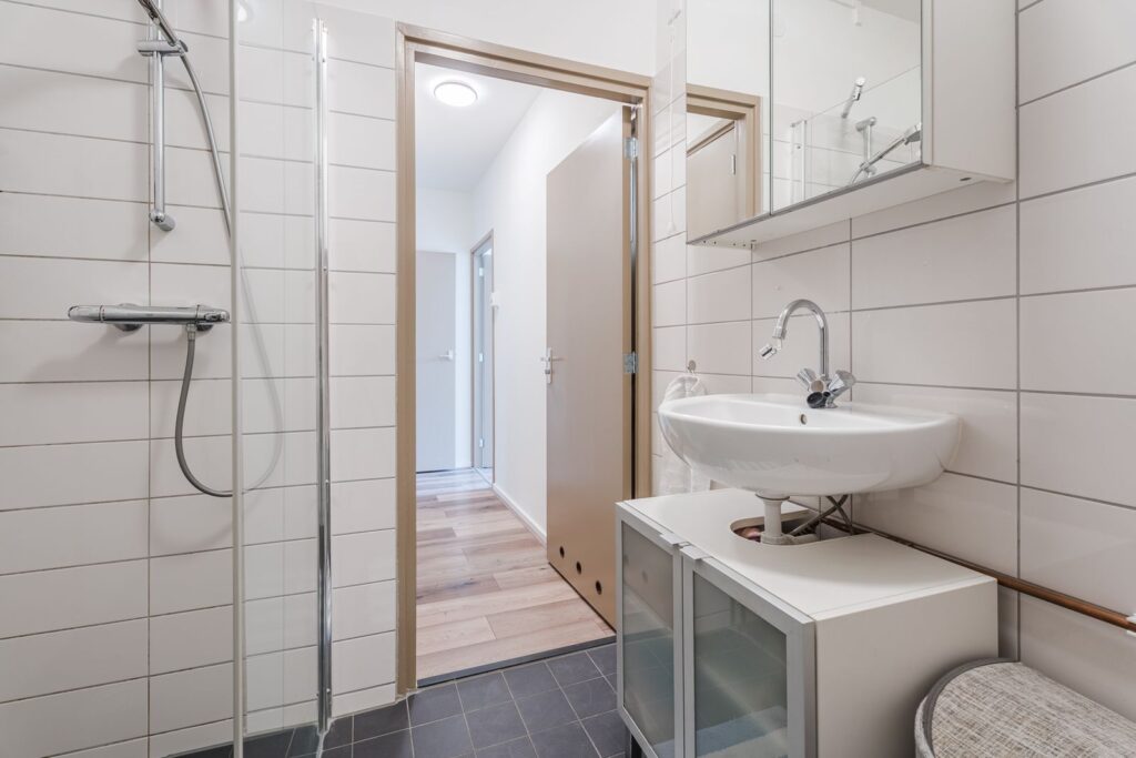 De badkamer is volledig betegeld en uitgerust met een ruime inloopdouche, wastafelmeubel en de warmwaterboiler.