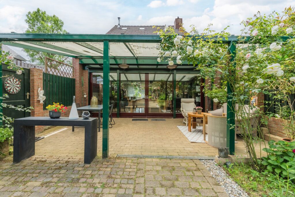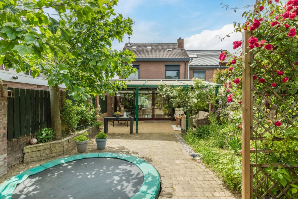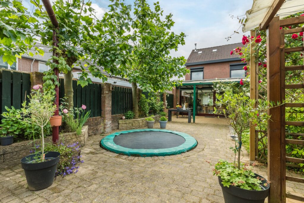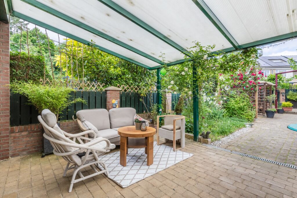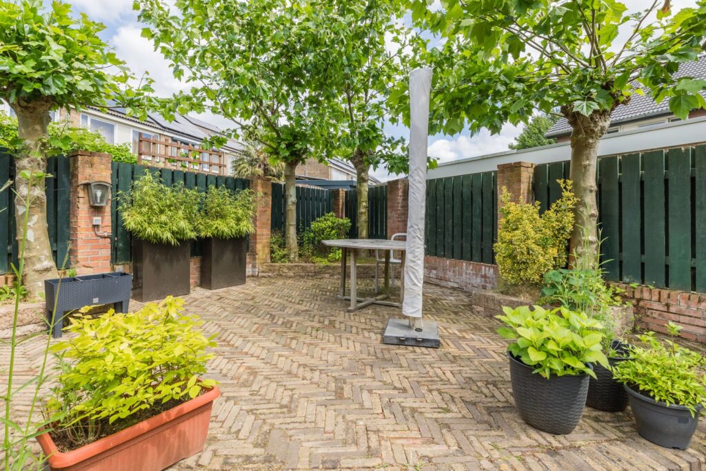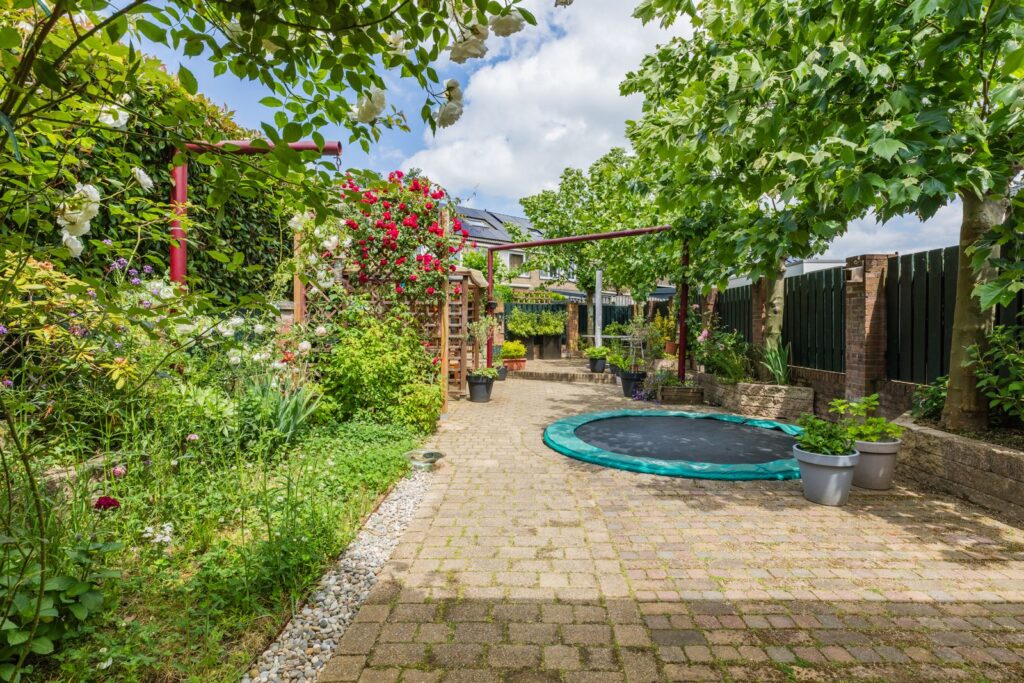 De diepe achtertuin met 6 bolplatanen heeft diverse terrassen en borders met beplanting (klimrozen, hortensia’s en diverse meerjarige planten), verlichting en een overkapping.