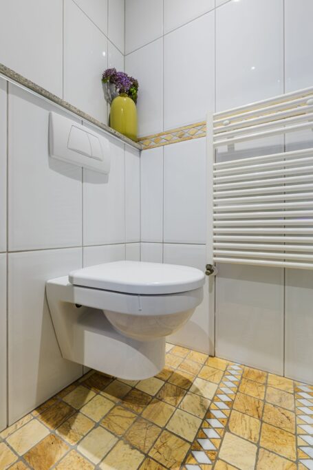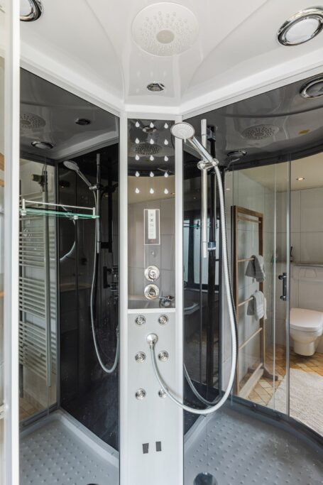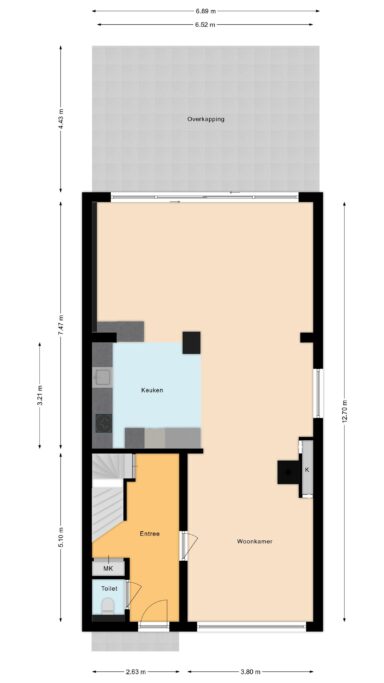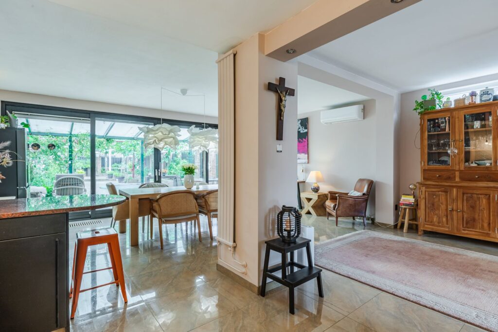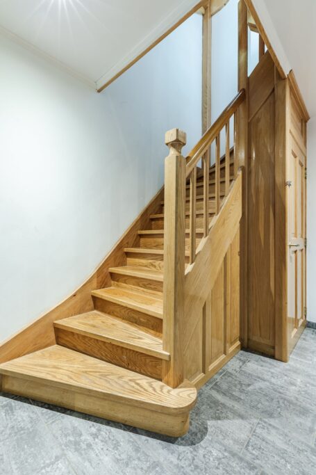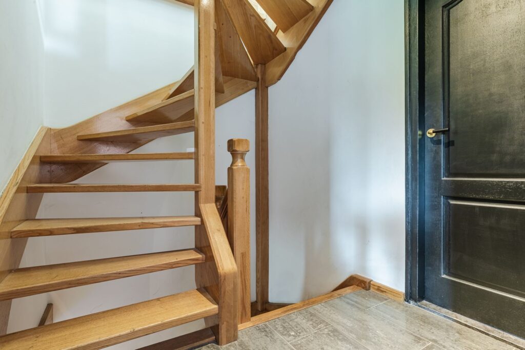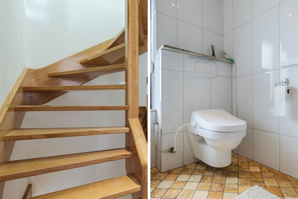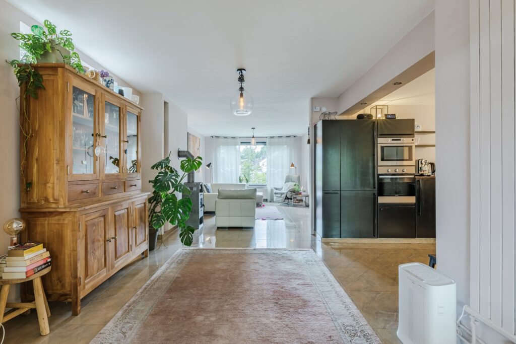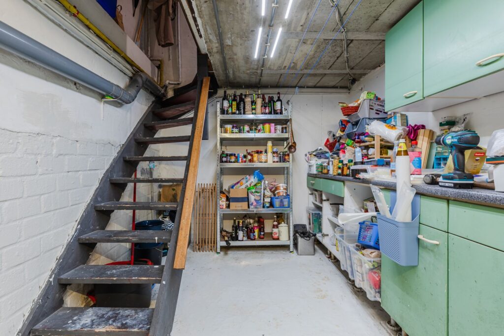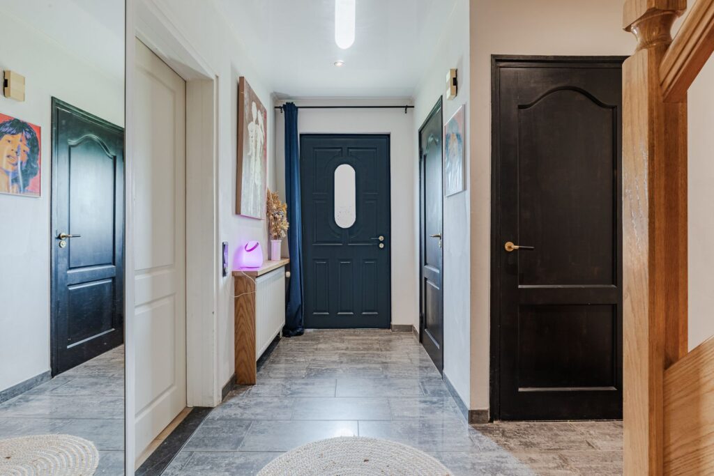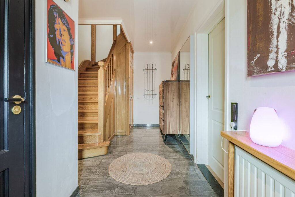 De royale entree geeft toegang tot de garderobe, de meterkast, de prachtige eiken trapopgang, het geheel betegeld gastentoilet, de woonkamer en de grote provisiekelder op stahoogte, waar zich de witgoedaansluitingen bevinden.