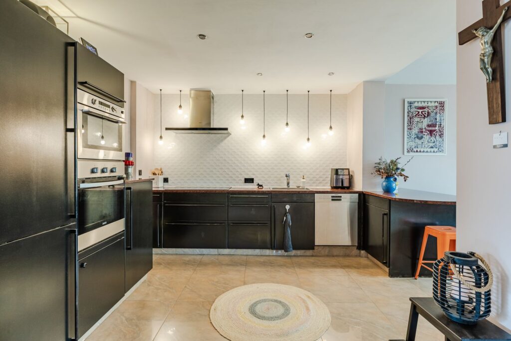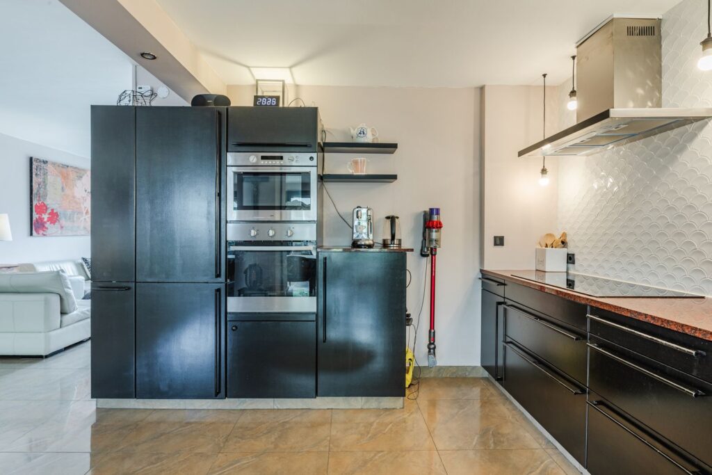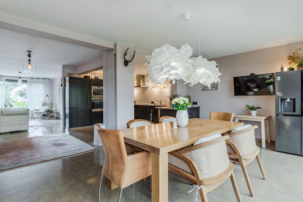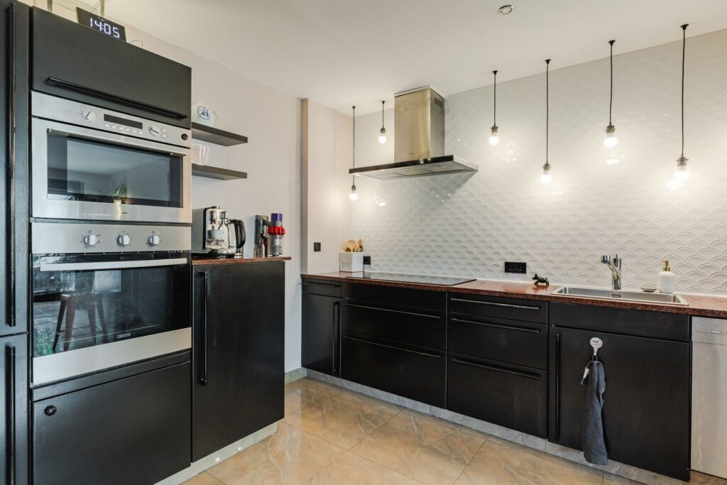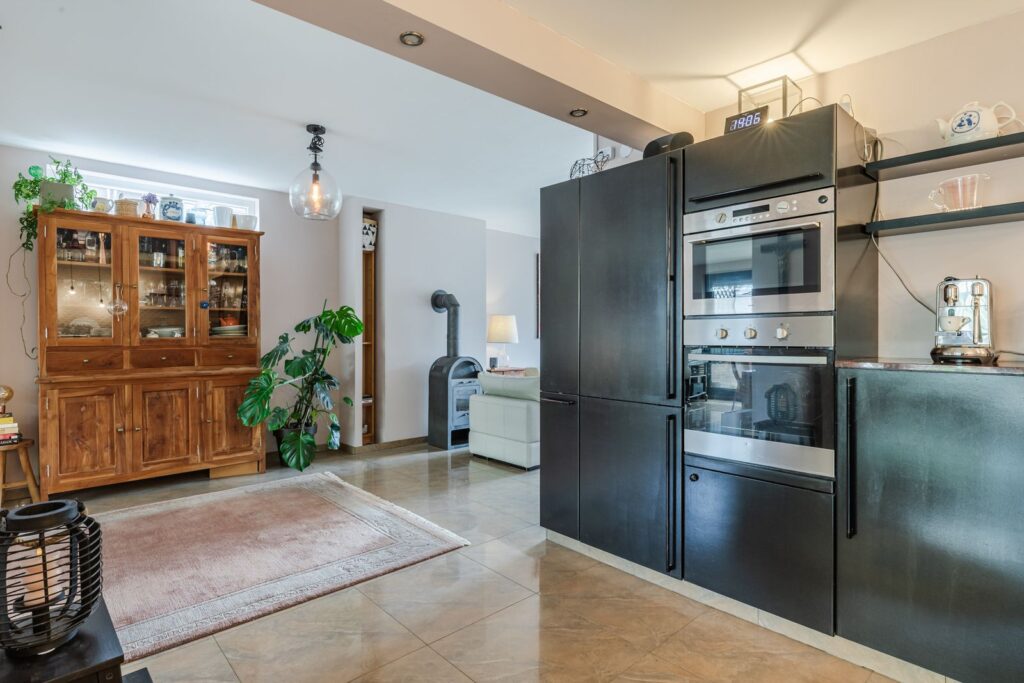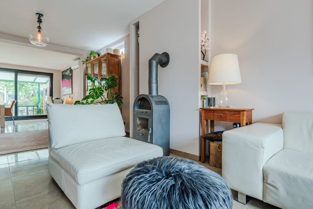 De woonkamer met open keuken, totaal 70 m2 heeft een granieten vloer v.v. vloerverwarming en een houtkachel. De gemoderniseerde keuken heeft 2 ovens en een 90 cm inductie kookplaat. Het geheel is afgewerkt met een granieten werkblad. In het uitgebouwde deel van de woonkamer (de tuinkamer) is een nieuwe airco geplaatst. De tuinkamer heeft een schuifpui over de volle breedte van het huis.