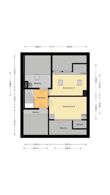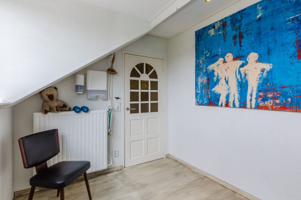 Vaste trapopgang, 2 slaapkamers (4,00x2,60 en 3,60x2,50) met houten vloer, waarvan één met grote dakkapel alsmede 2 ruime bergingen voor opslag en waar zich de cv-ketel (huur) en de omvormer van de zonnepanelen bevinden.