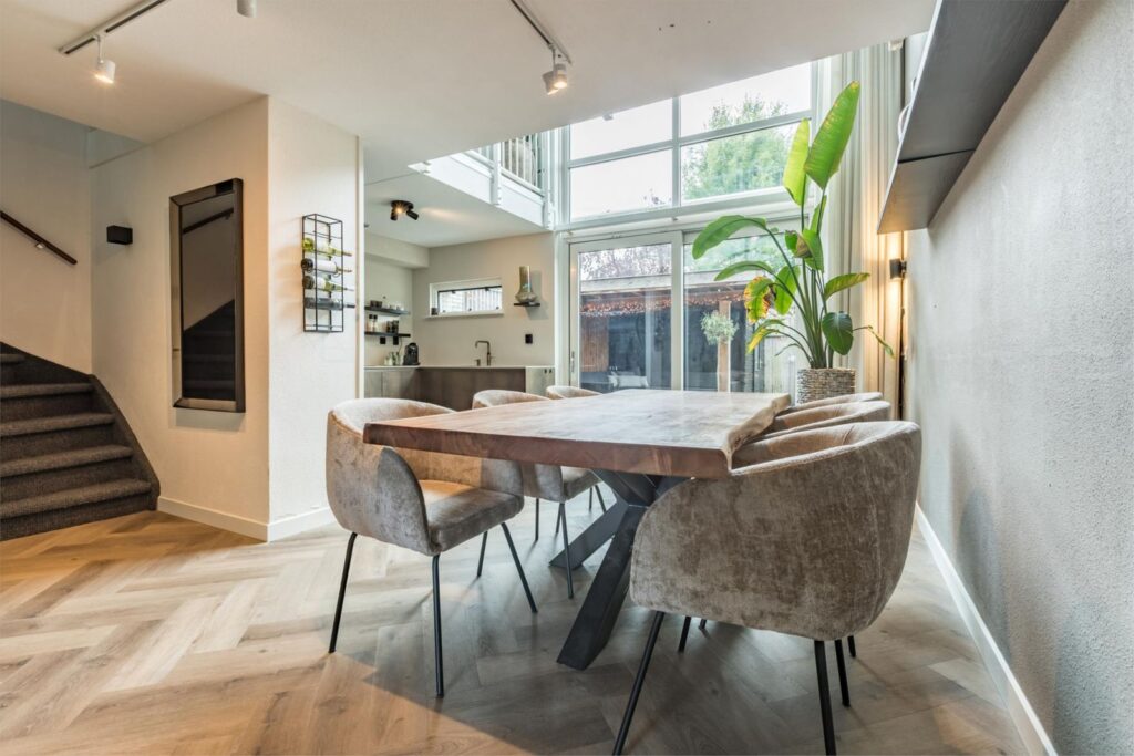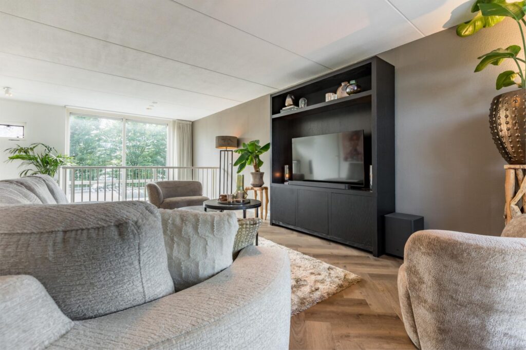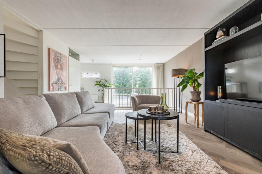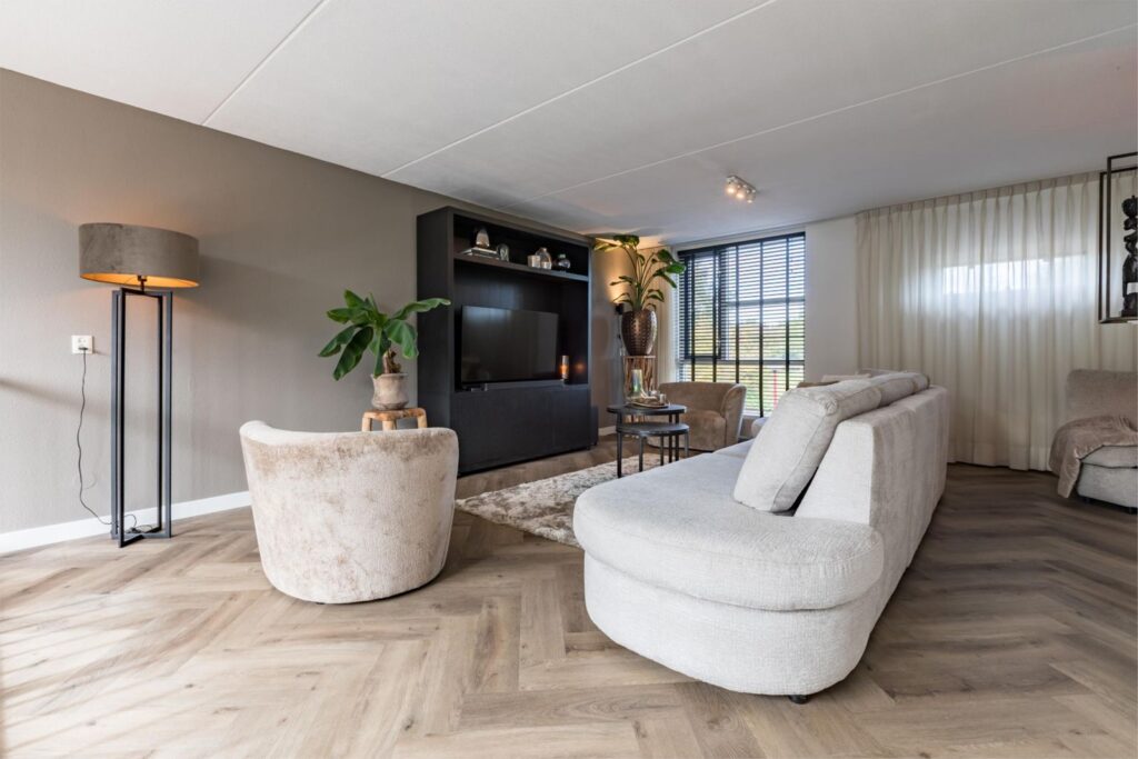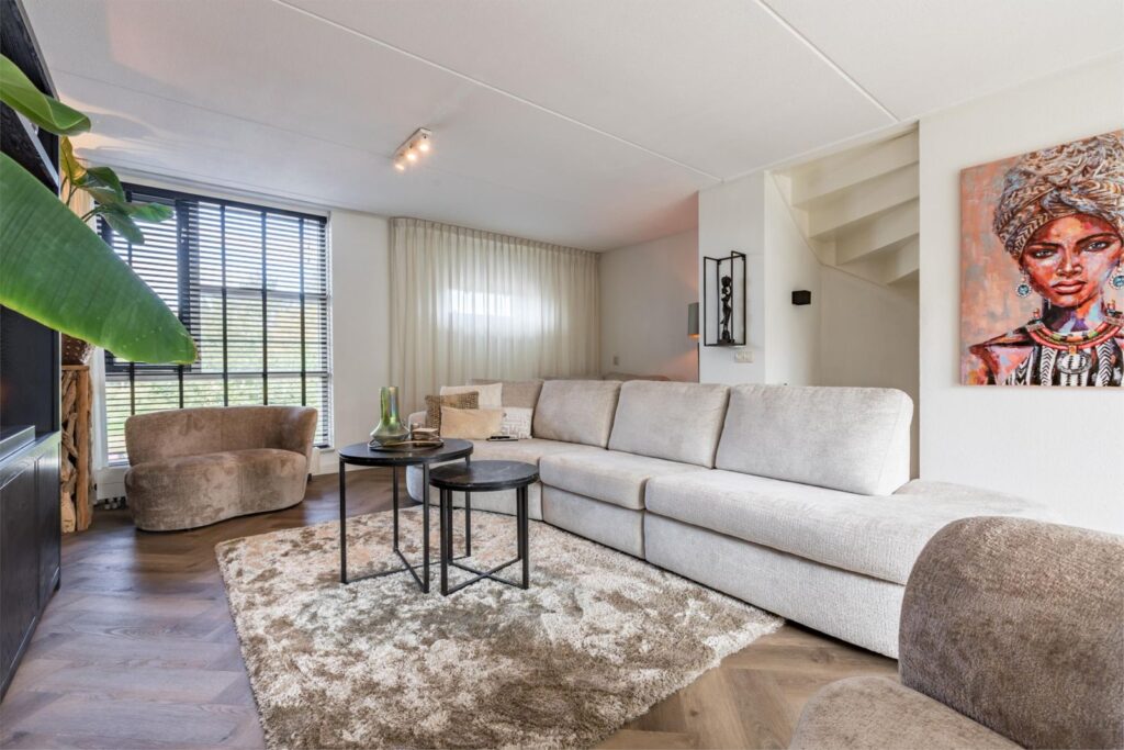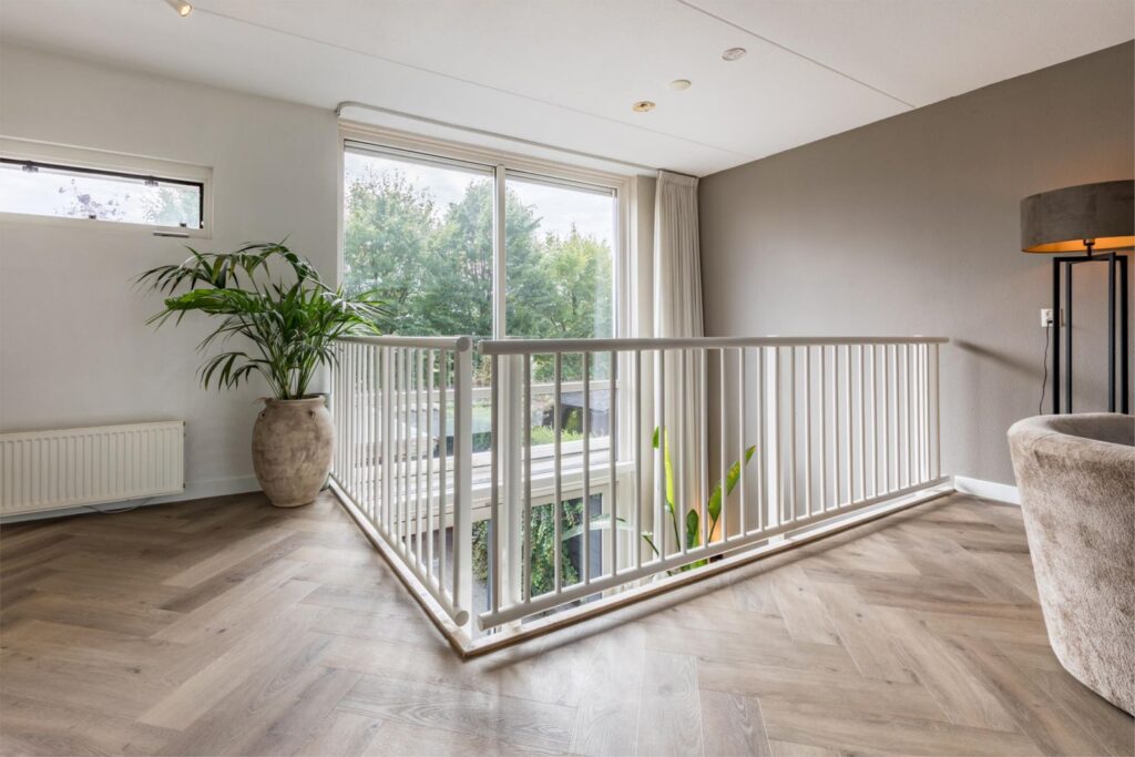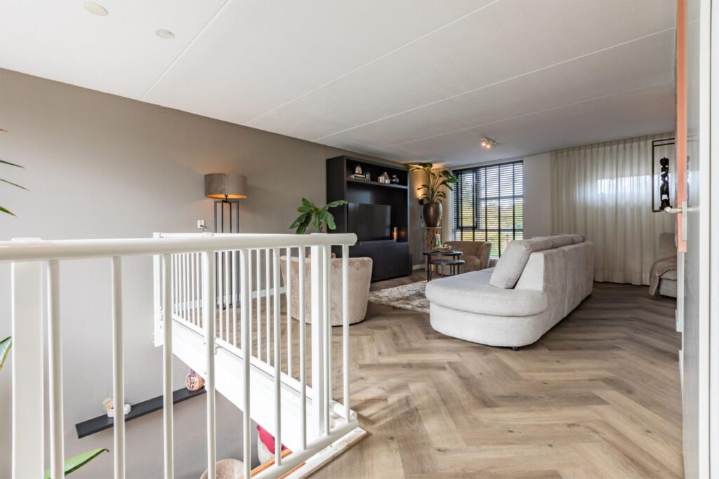 Een royale en lichte woonkamer met prachtig uitzicht aan de voorzijde. De vide zorgt voor een open, ruimtelijk gevoel en een mooie verbinding met de woonkeuken beneden.