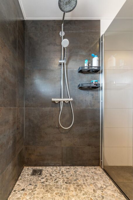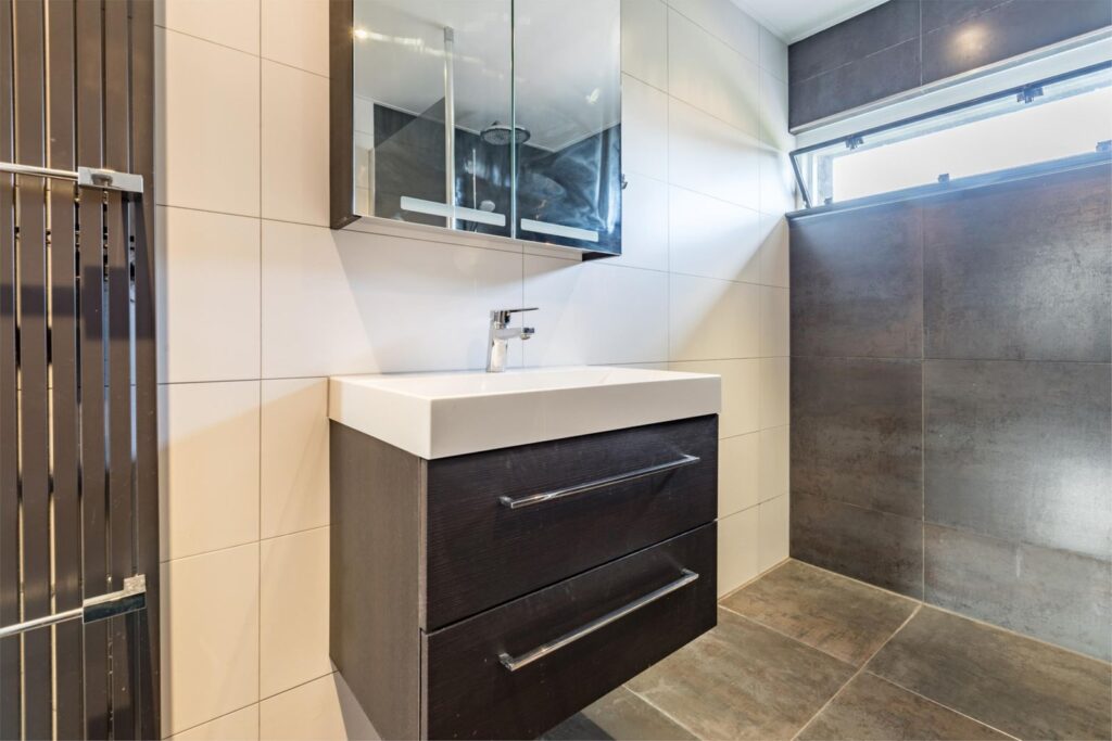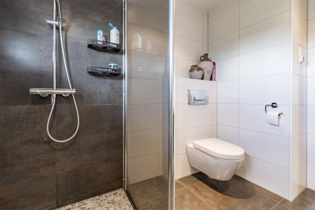 Drie slaapkamers en een moderne badkamer met vloerverwarming, wastafelmeubel, inloopdouche en tweede toilet.