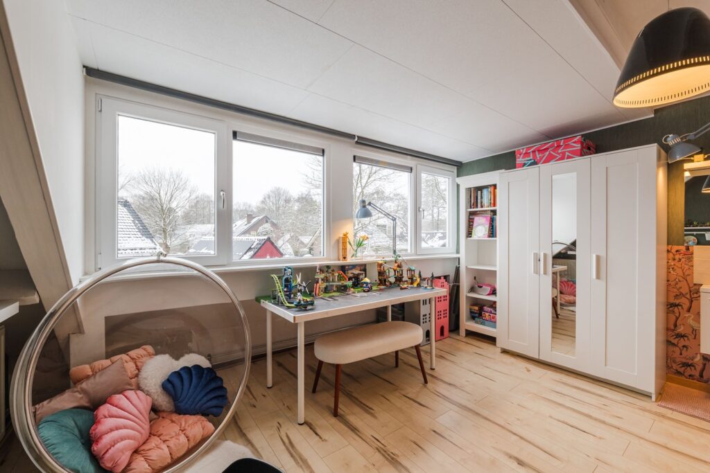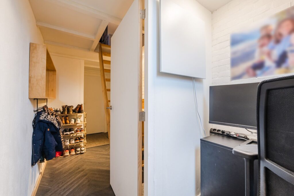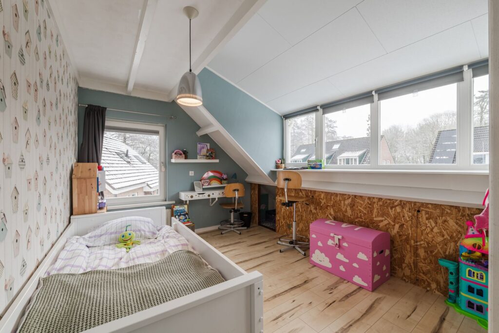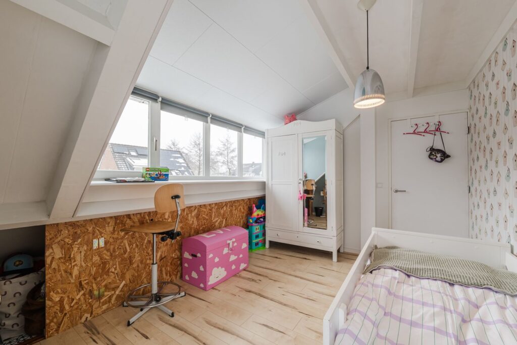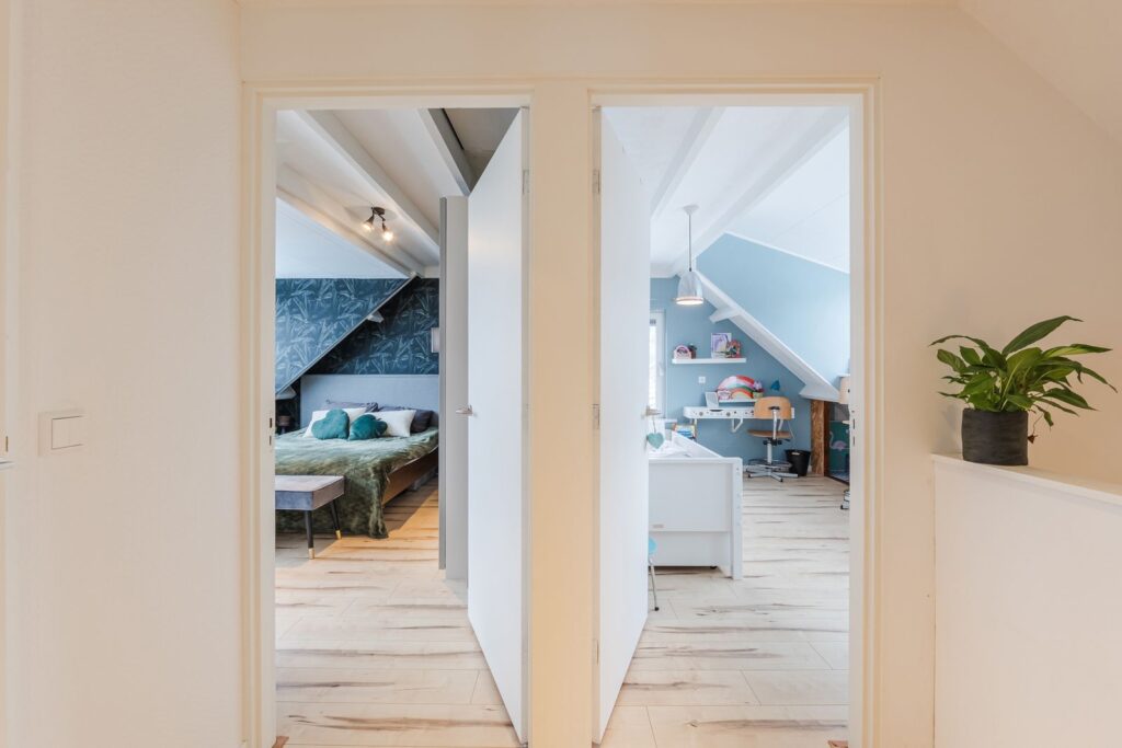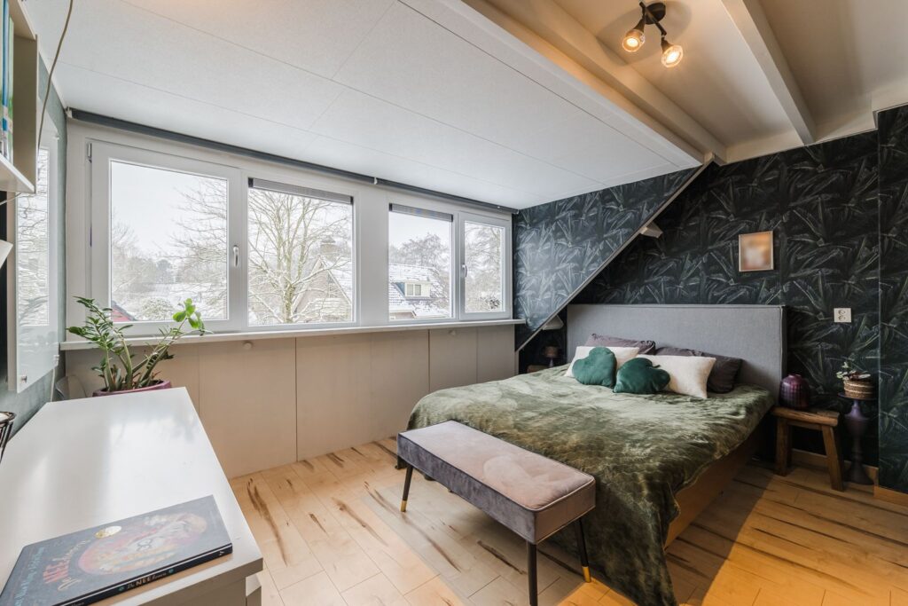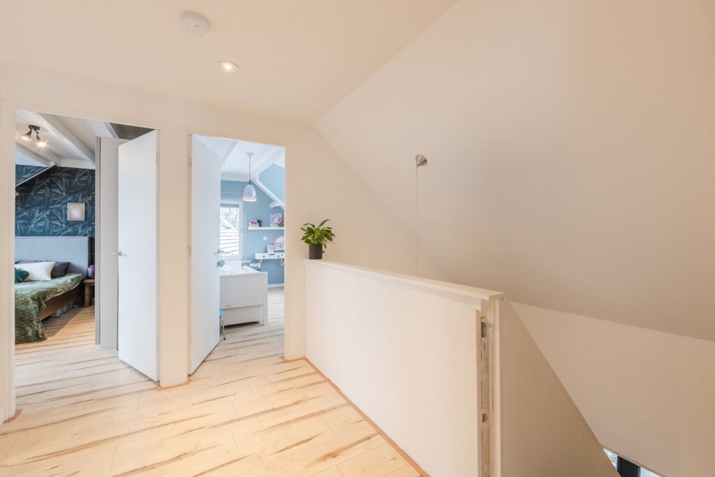 Boven zijn 4 grote lichte slaapkamers (17, 16, 14 en 12m2) en een badkamer (8m2) gesitueerd om een vide. Deze vide zorgt voor een ruimtelijke ervaring. De volledig gerenoveerde badkamer is voorzien van een hangtoilet, ligbad, regendouche, dubbele wastafel en extra infraroodverwarming. 3 van de 4 slaapkamers hebben knieschotten en 1 slaapkamer heeft ingebouwd meubilair (bureau, kast en bed) ook heeft deze slaapkamer een balkon.
