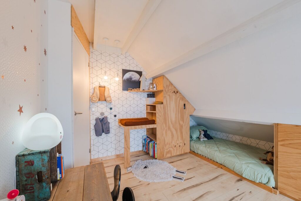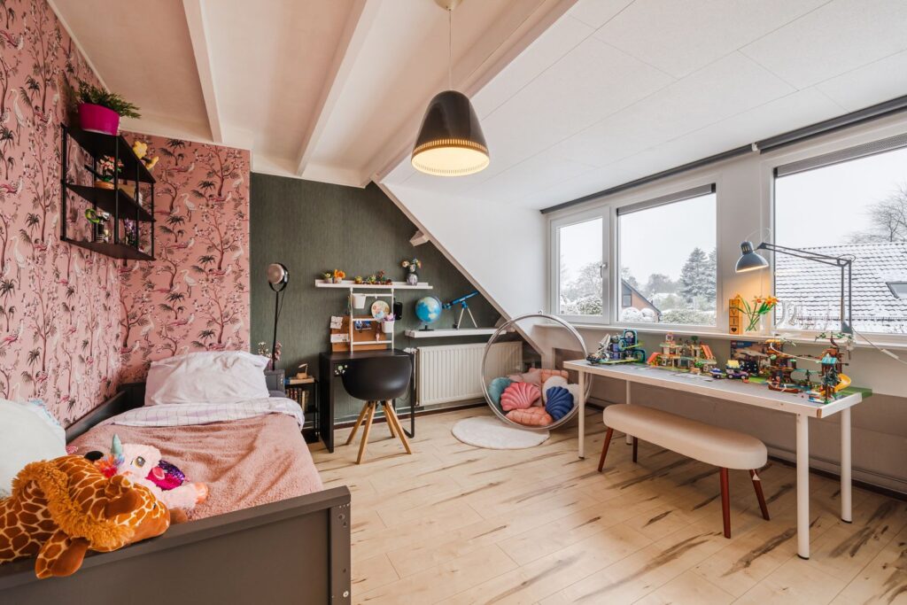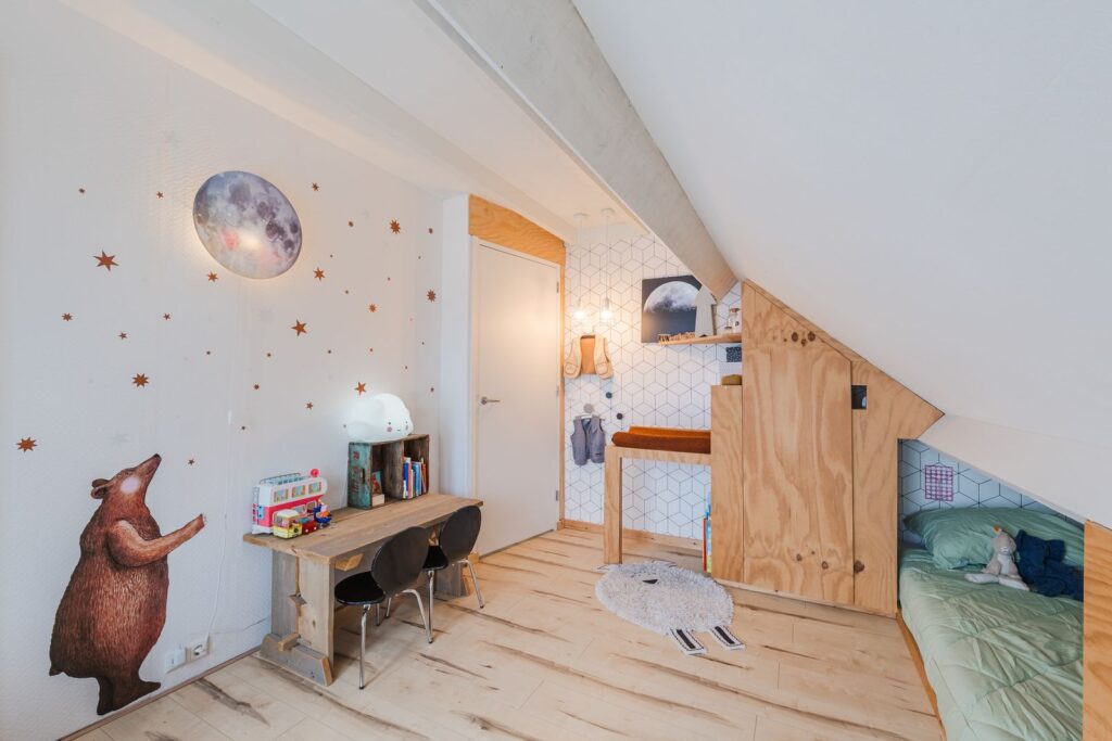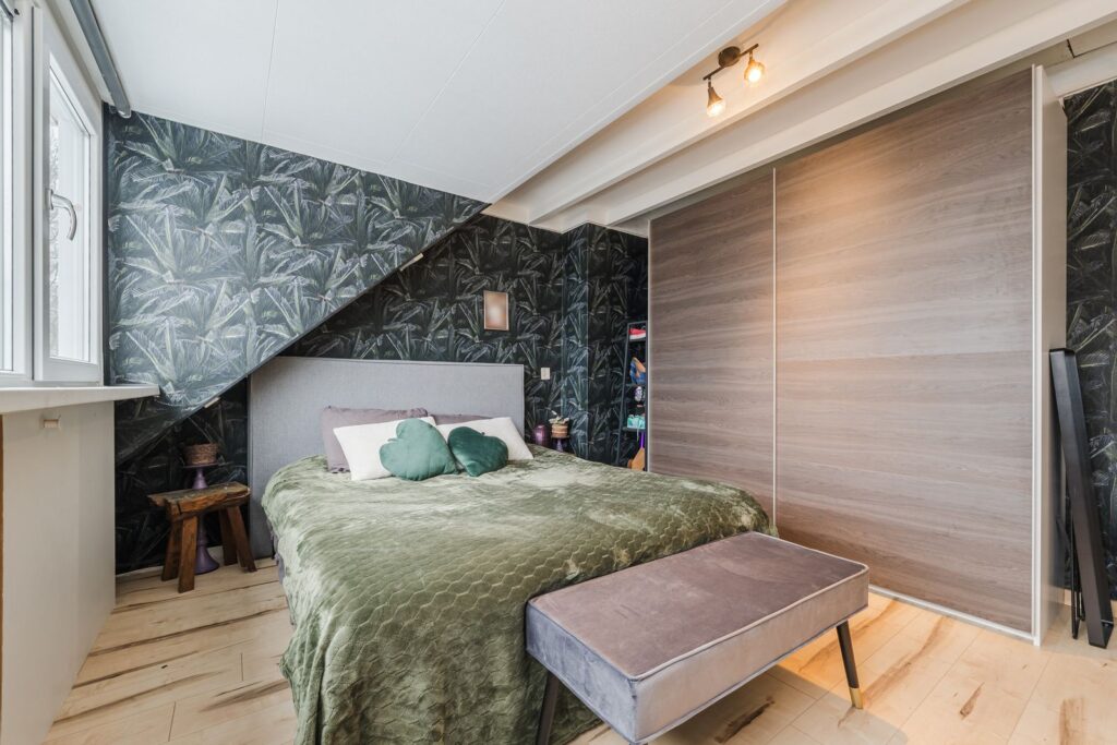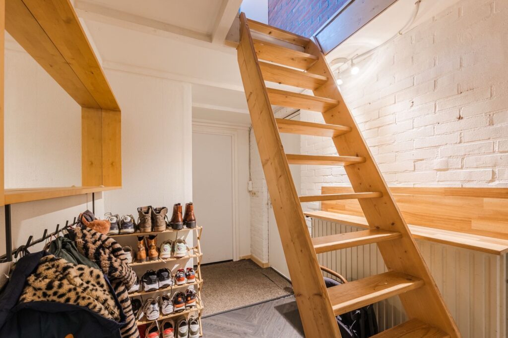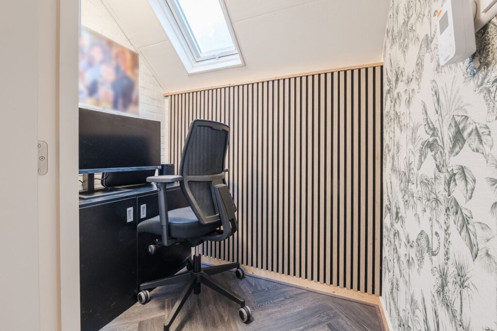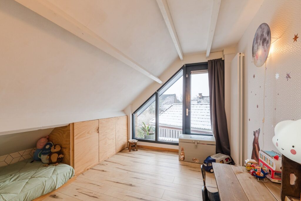 Boven zijn 4 grote lichte slaapkamers (17, 16, 14 en 12m2) en een badkamer (8m2) gesitueerd om een vide. Deze vide zorgt voor een ruimtelijke ervaring. De volledig gerenoveerde badkamer is voorzien van een hangtoilet, ligbad, regendouche, dubbele wastafel en extra infraroodverwarming. 3 van de 4 slaapkamers hebben knieschotten en 1 slaapkamer heeft ingebouwd meubilair (bureau, kast en bed) ook heeft deze slaapkamer een balkon.