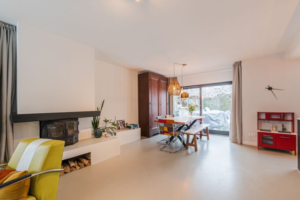 U komt binnen in een ruime hal die hoogte biedt door de vide. Vanuit de hal loopt u naar de ruime woonkamer met open keuken (56m2). De vernieuwde keuken bestaat uit een kookeiland van 3 meter breed, deze is voorzien van de nodige inbouw apparatuur. Aansluitend aan de open keuken is ruimte voor een grote eettafel. Vanaf de eettafel heeft u uitzicht op de groene tuin. Deze loopt u in door de schuifdeur in de pui te openen. In dezelfde ruimte is de lichte living waar ook een sfeervolle open haard aanwezig is. Deze gehele ruimte is voorzien van een professionele pu gietvloer en nieuwe vloerverwarming en is daarom zeer comfortabel.