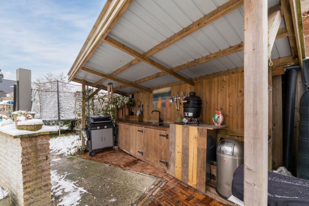 Naast het schilderwerk is er buitenshuis nog veel meer gedaan, zo is er een schuur met overkapping geplaatst. Ook is er een buitenkeuken gebouwd, deze is voorzien van elektriciteit en water. Alle houten dakgoten, windveren en andere bekleding zijn in 2025 vervangen door antraciet polyester en keralit. Het balkon is volledig gerenoveerd en wordt nog voorzien van een nieuw stalen hekwerk. De schoorstenen zijn opnieuw gevoegd en geïmpregneerd, het zadeldak is gecoat en waar nodig is het lood vernieuwd. Uiteraard is de woning voorzien van zonnepanelen en tot slot is de pui van de garage vervangen door een geïsoleerde antraciete aluminium deur met thermisch onderbroken kozijnen.