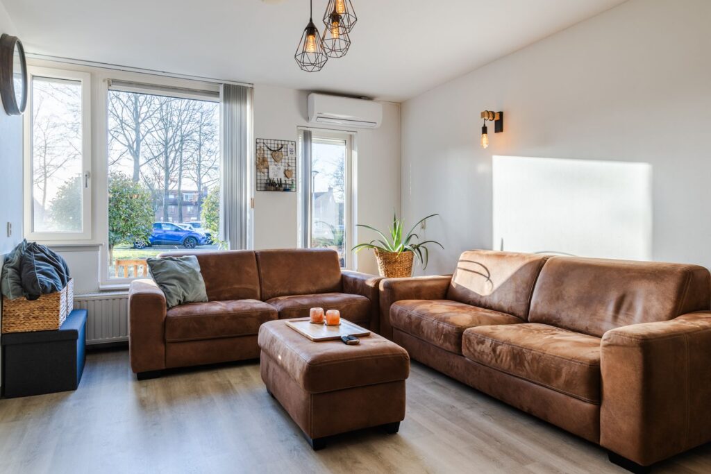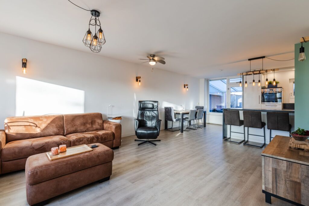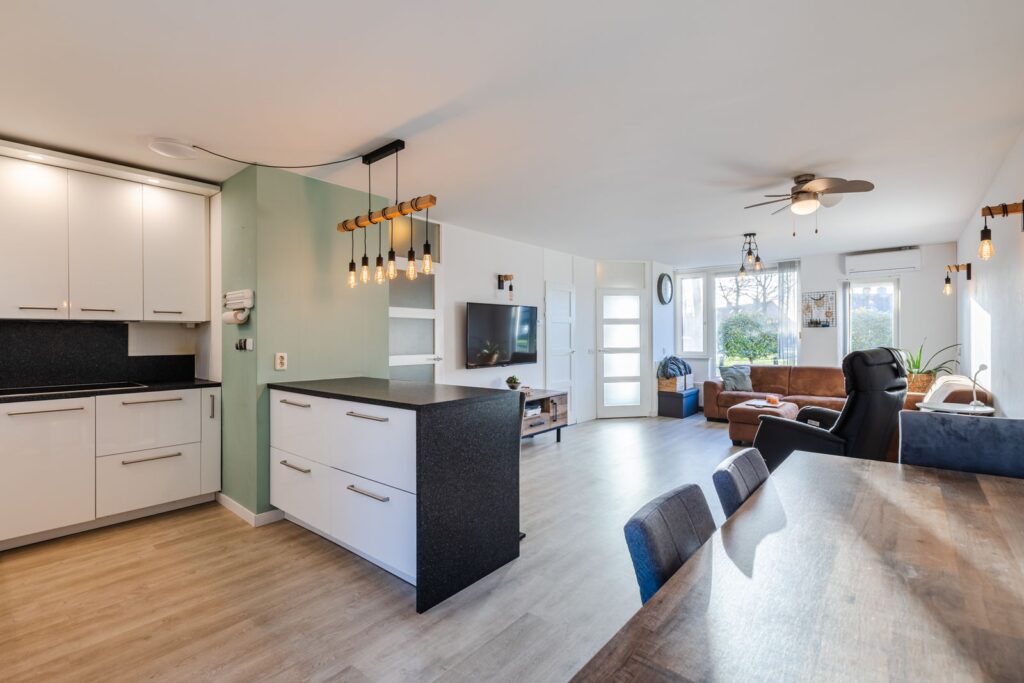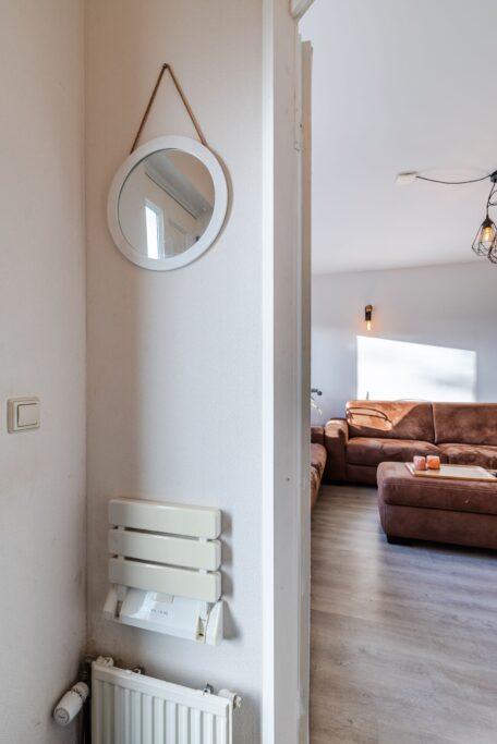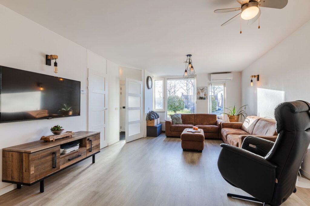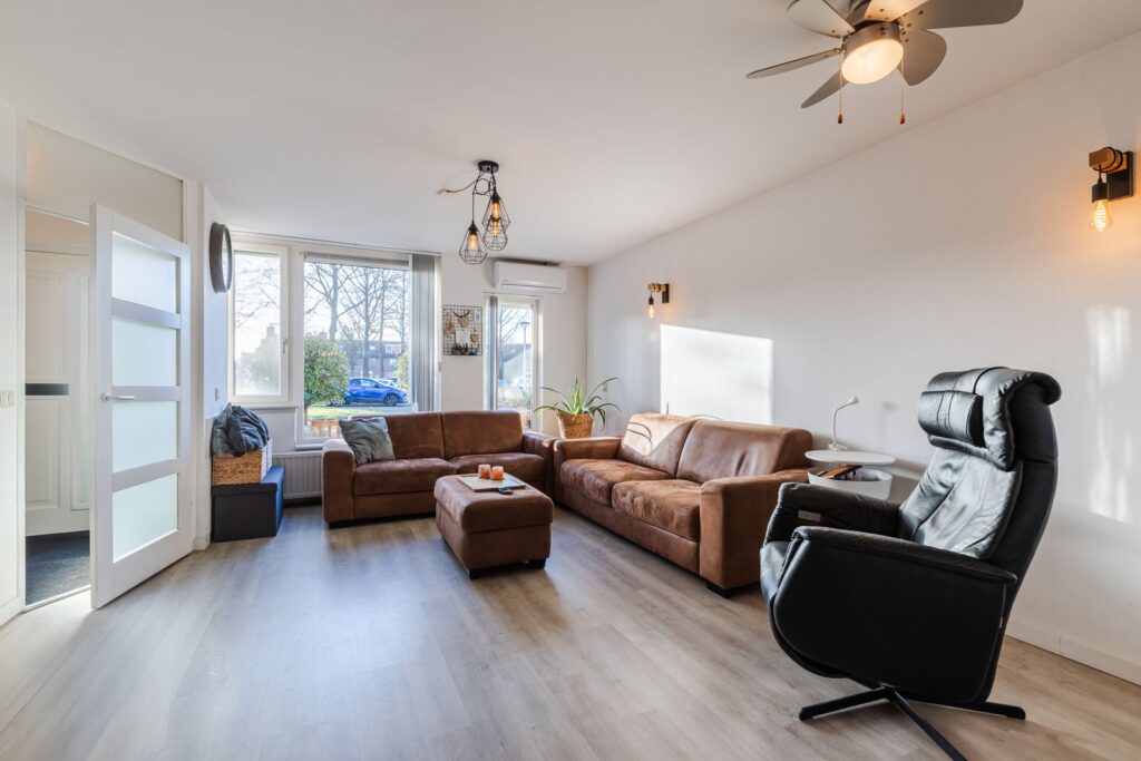 We komen via de voordeur in de hal met garderobe en meterkast. Vanuit de hal lopen we de woonkamer in, een heerlijke ruimte die meteen opvalt door de vele lichtinval. De zithoek kan royaal worden opgesteld aan de voorzijde en dan blijft er meer dan genoeg ruimte over voor een ruime eethoek aan de achterzijde. De woonkamer is voorzien van airconditioning (koelen en verwarmen), kunststof kozijnen met draai/kiepraam, nieuwe radiatoren en op de vloer ligt een nette laminaatvloer. Aan de voorzijde zijn de ramen voorzien van elektrische zonnescreens met afstandbediening en ventilatierooster.