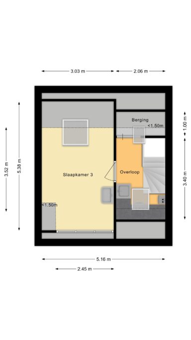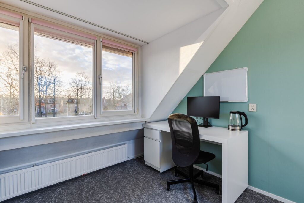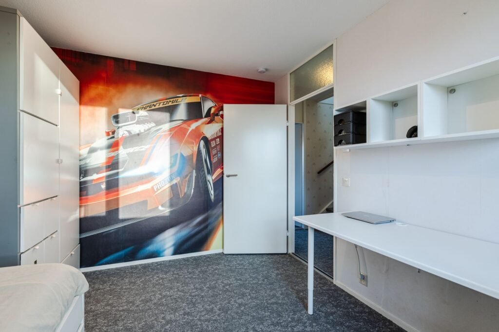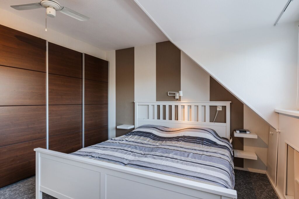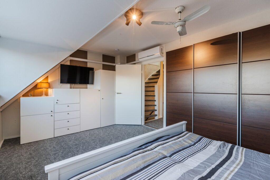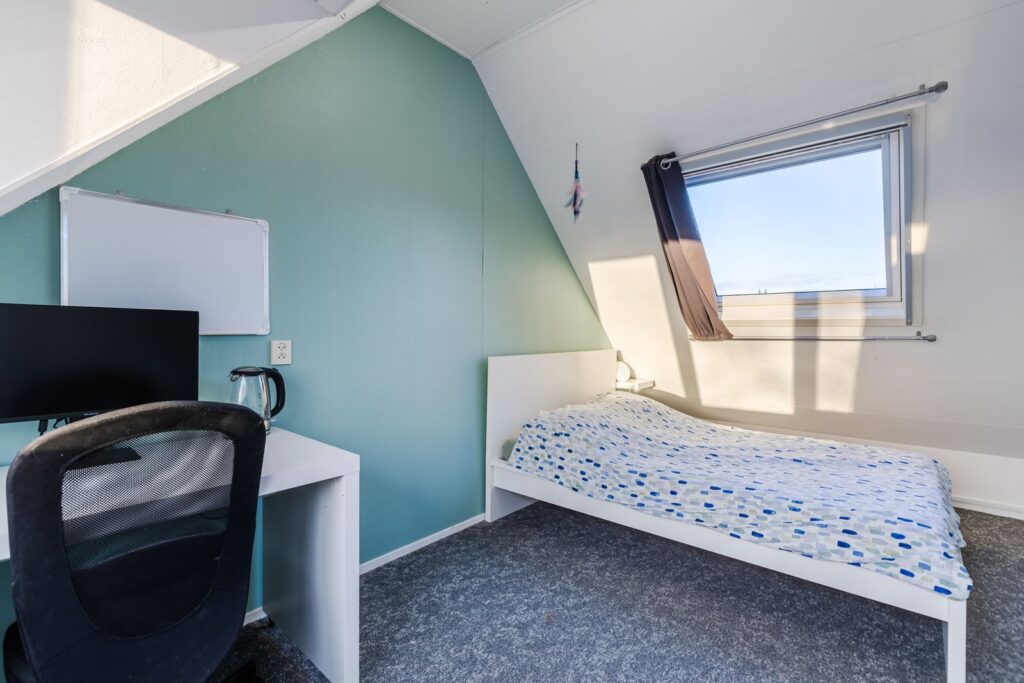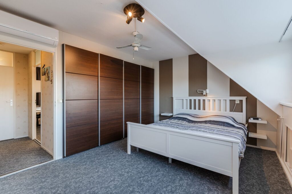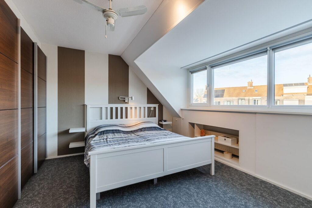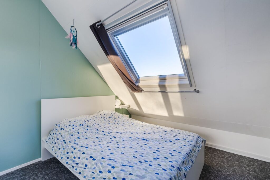 Naast de overloop vinden we de 3de slaapkamer. Door de hier geplaatste dakkapel (voorzijde) en een groot Velux dakraam aan de achterzijde is dit een lichte slaapkamer met veel ruimte. De dakkapel is voorzien van kunststof kozijnen met dubbele draai/kiepramen, ventilatierooster en nieuwe radiator. De dakkapel is voorzien van een ventilatierooster en elektrisch rolluik met afstandsbediening. De extra wastafel met meubel, spiegel en verlichting maken deze slaapkamer compleet.