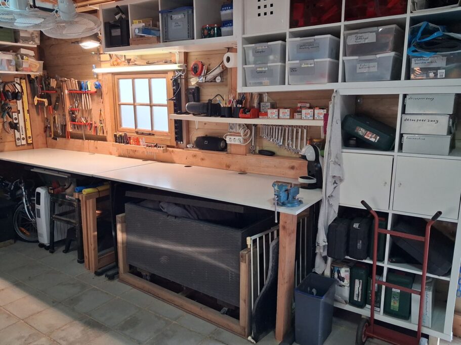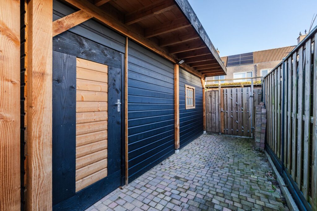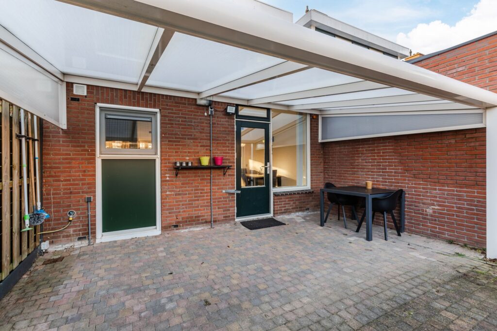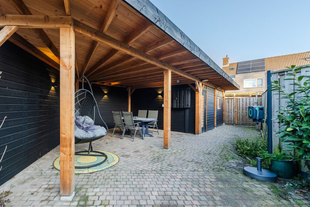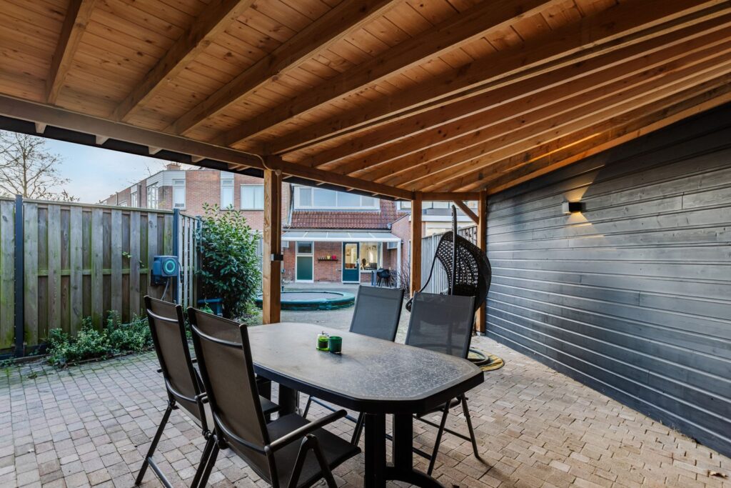 Via de achterdeur lopen we de achtertuin in waar we een lichte aluminium overkapping van ca. 15m2 treffen. Dit is dé ideale plek om te genieten van een heerlijk ontbijt in de ochtendzon. De achtertuin heeft een speelse knik waardoor er altijd zon en schaduw is te vinden. De lange zijde van de tuin meet in totaal maar liefst 26,3 mtr. Eind 2024 is er achterin de tuin een extra overkapping geplaatst van ca. 55 m2 waarvan 24m2 is ingericht als schuur/werkplaats. De overkapping en schuur zijn voorzien van elektra en verlichting.