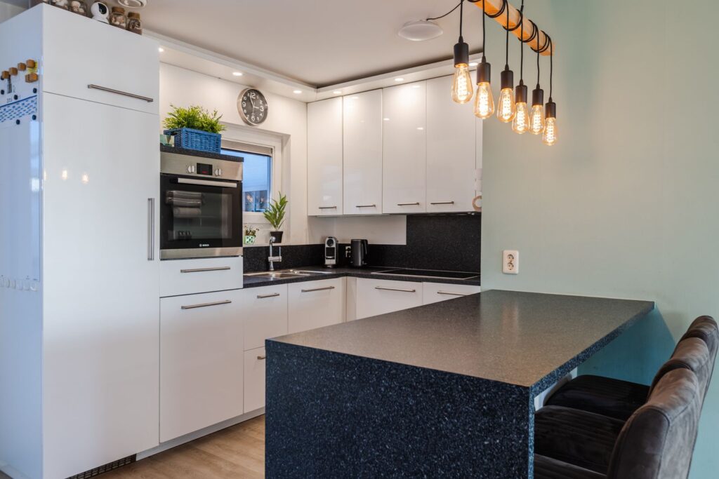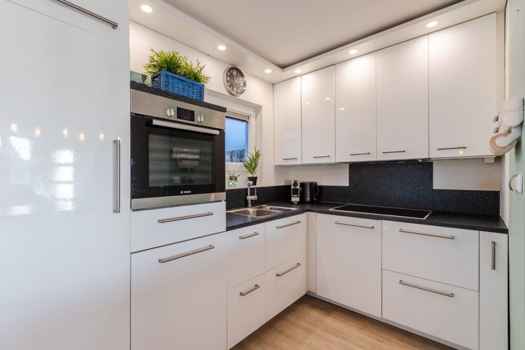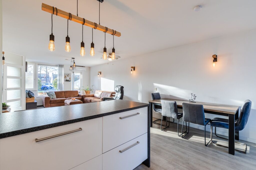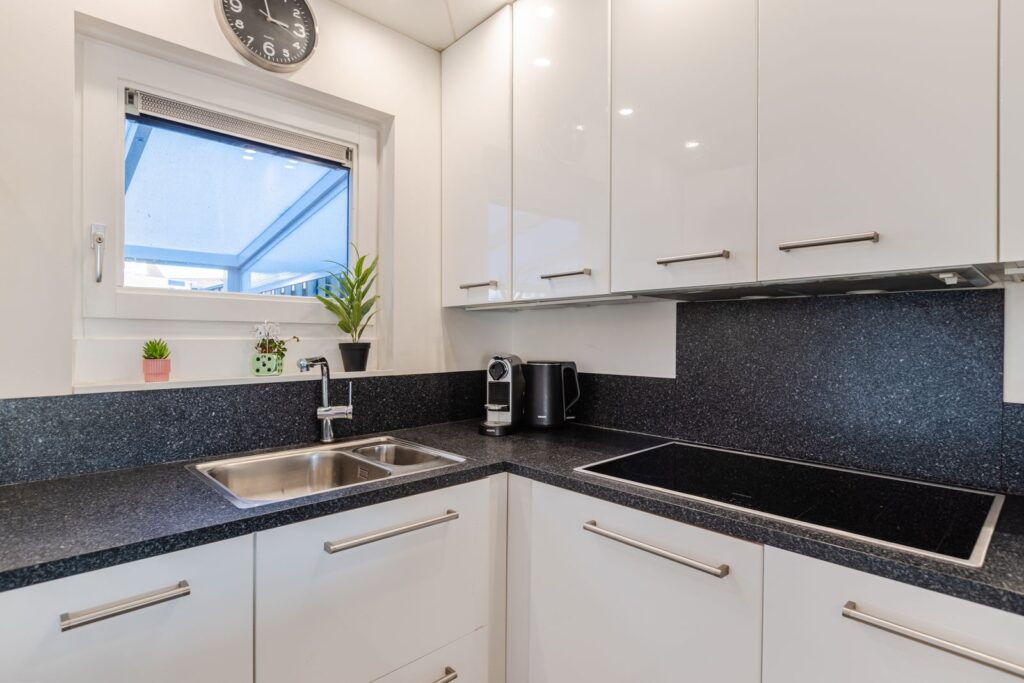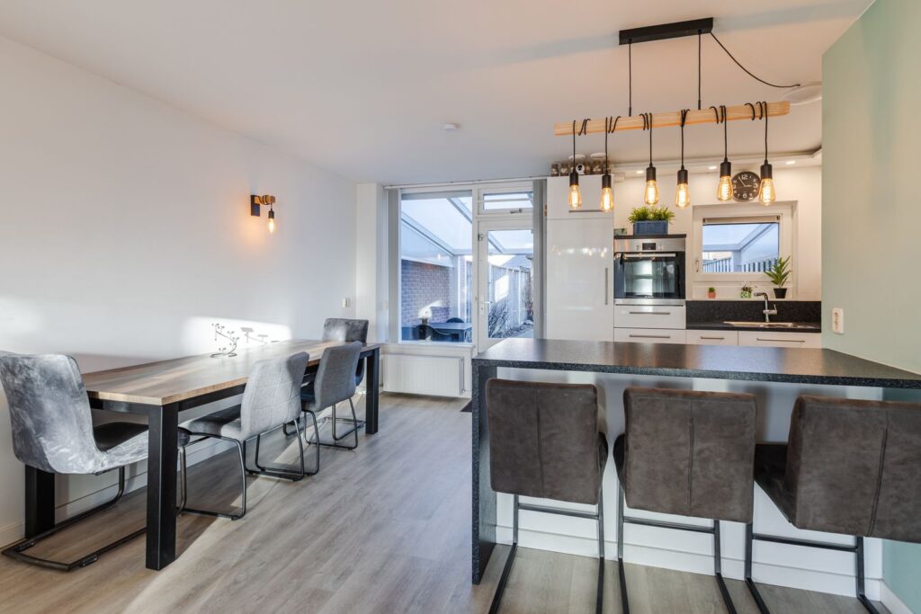 Aan de achterzijde van de woning vinden we de keuken, die in open verbinding staat met de woonkamer. Uitgevoerd in een praktische L-opstelling met een bar biedt deze veel bergruimte en diverse ingebouwde apparaten. Zo is er een vaatwasser, keramische 5-pits kookplaat met extra boost functie, afzuigkap, oven en ruime koel/vriescombinatie aanwezig. Vanuit de keuken is er een goed uitzicht op de achtertuin door het draai/kiepraam bij de dubbele spoelbak. De keuken is verder voorzien van mechanische ventilatie.