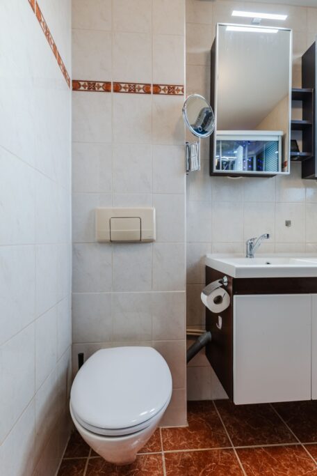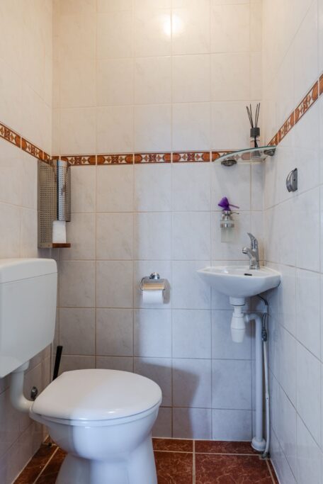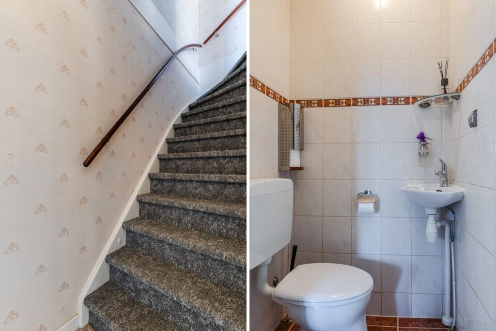In de 2e hal met trapopgang vinden we het toilet met fontein en mechanische ventilatie.