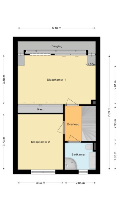 Een mooie, ruime verdieping met twee slaapkamers en een badkamer. Aan de voorzijde zit de badkamer met luxe douche, wastafelmeubel met dubbel wasbak, zwevend toilet en handdoekradiator. De luxe douchecabine beschikt over een regendouche, 6 geïntegreerde rugmassage jets, handdouche, ventilator, radio en verlichting.