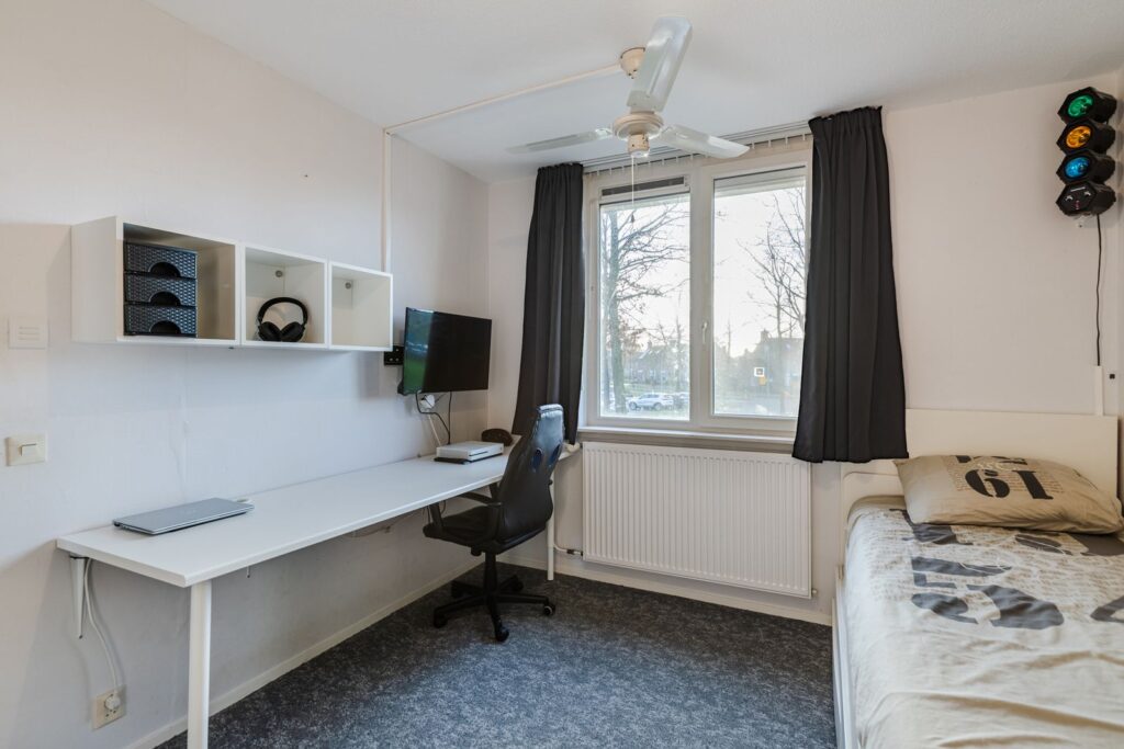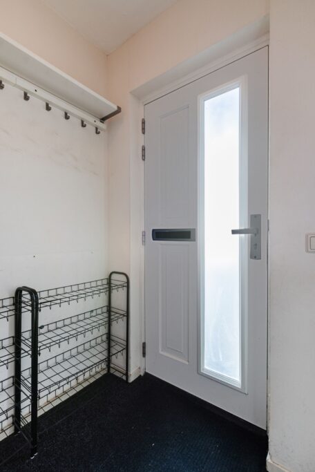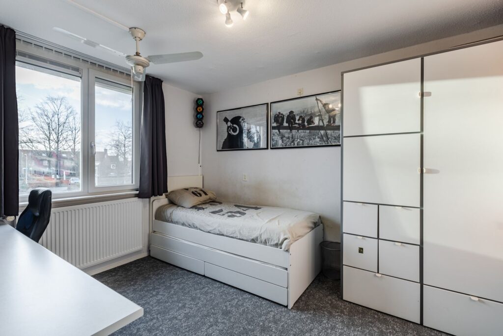 Naast de badkamer vinden we de eerste slaapkamer aan de voorzijde van de woning. Deze slaapkamer is voorzien van kunststof kozijnen met draai/kiepraam, ventilatierooster, nieuwe radiator en elektrisch rolluik met afstandsbediening.