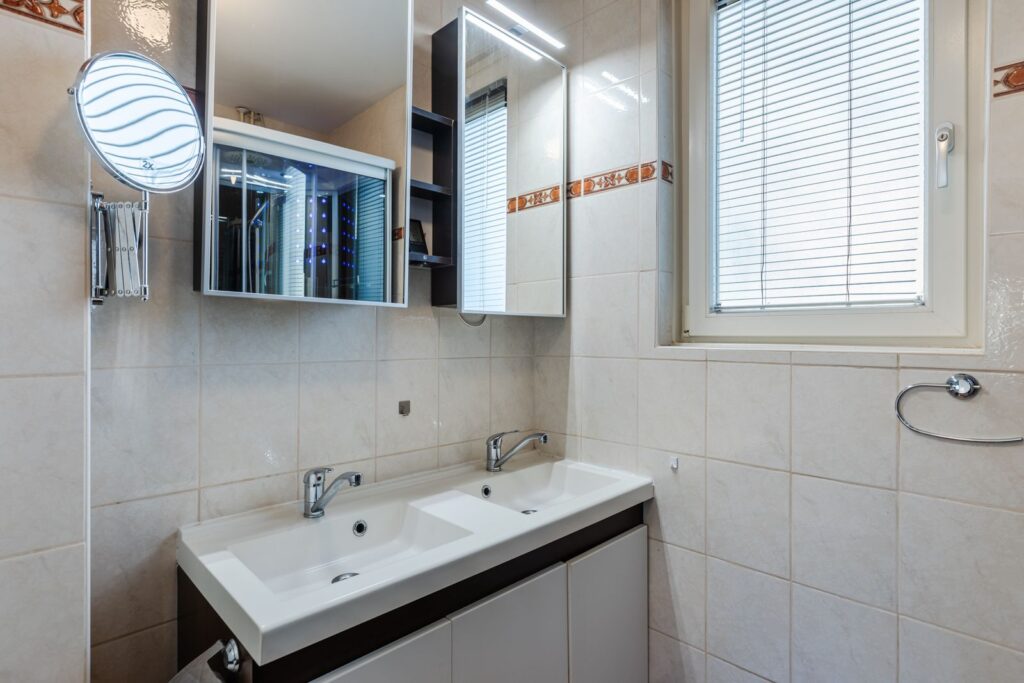 De badkamer is verder voorzien van dubbele spiegelkasten met verlichting en stopcontacten, scheer/make-up spiegel, mechanische ventilatie met automatische vochtsensor, kunststof kozijn met draai/kiepraam en ventilatierooster.