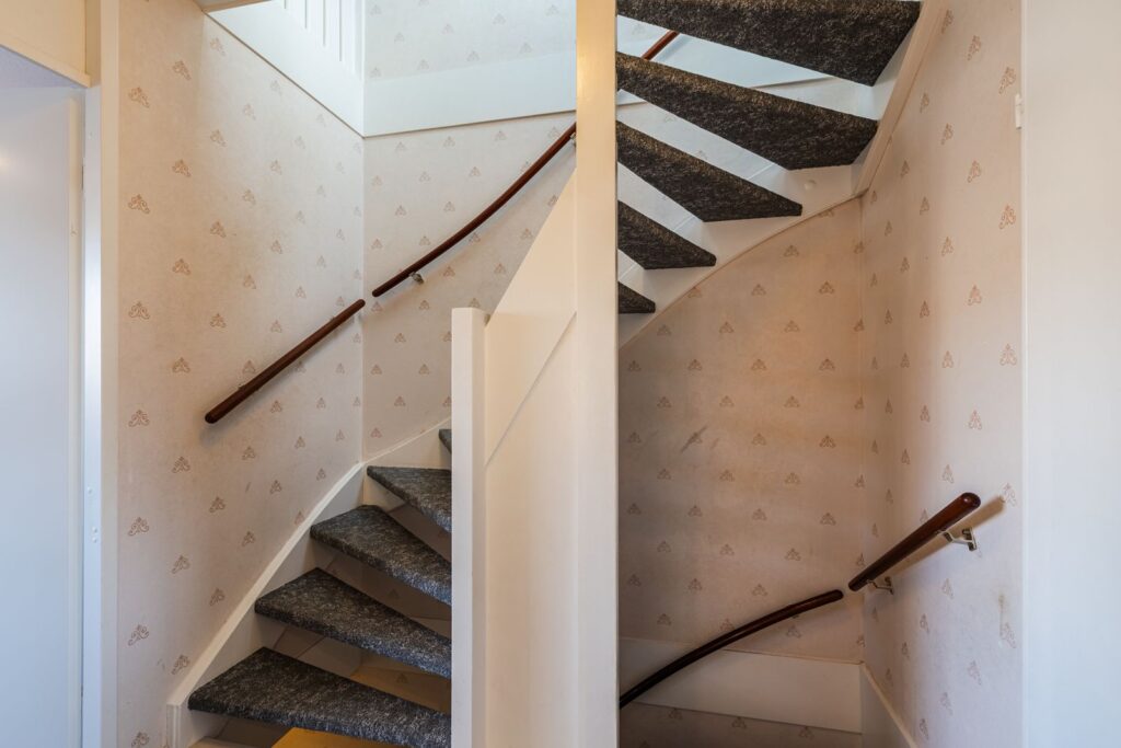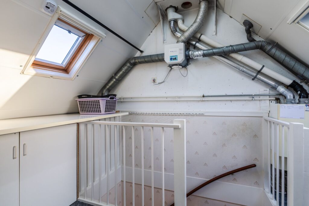 Via de trap bereiken we de lichte overloop op de tweede verdieping. De overloop is voorzien van Velux dakramen aan zowel de voor- als de achterzijde. Beide dakramen zijn voorzien van zonwerende rolgordijnen en horren. Aan de voorzijde tref je hier de cv-ketel (HR Remeha Avanta), mechanische ventilatie, aansluiting voor de wasmachine- en droger en een extra wastafel met mengkraan en handdouche functie.