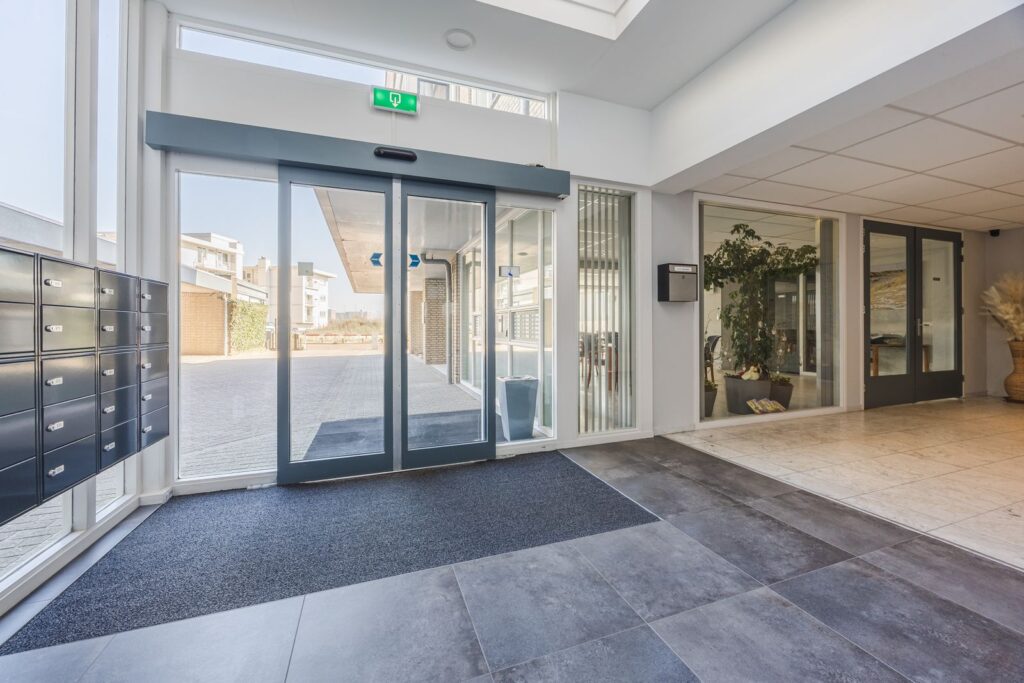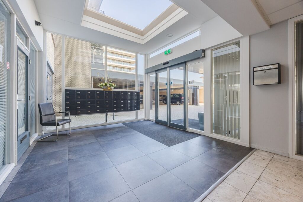 Entree met brievenbussen, bellentableau en 2 liften om naar de 5e verdieping te gaan.