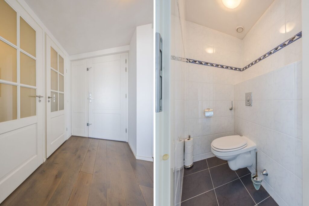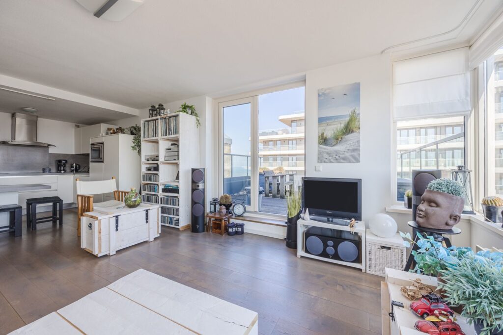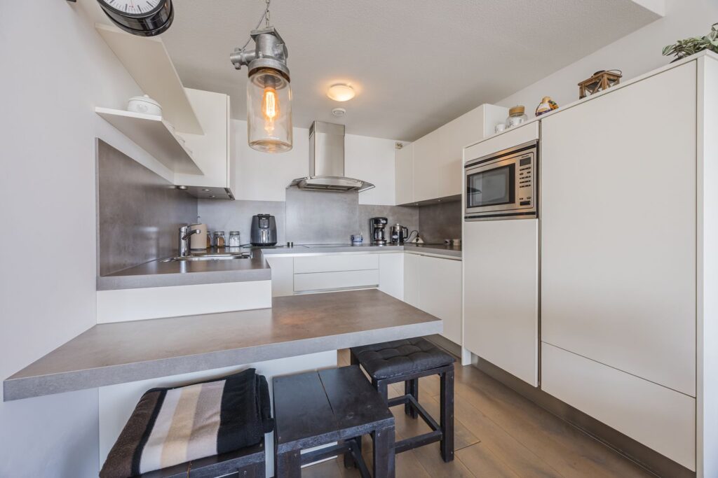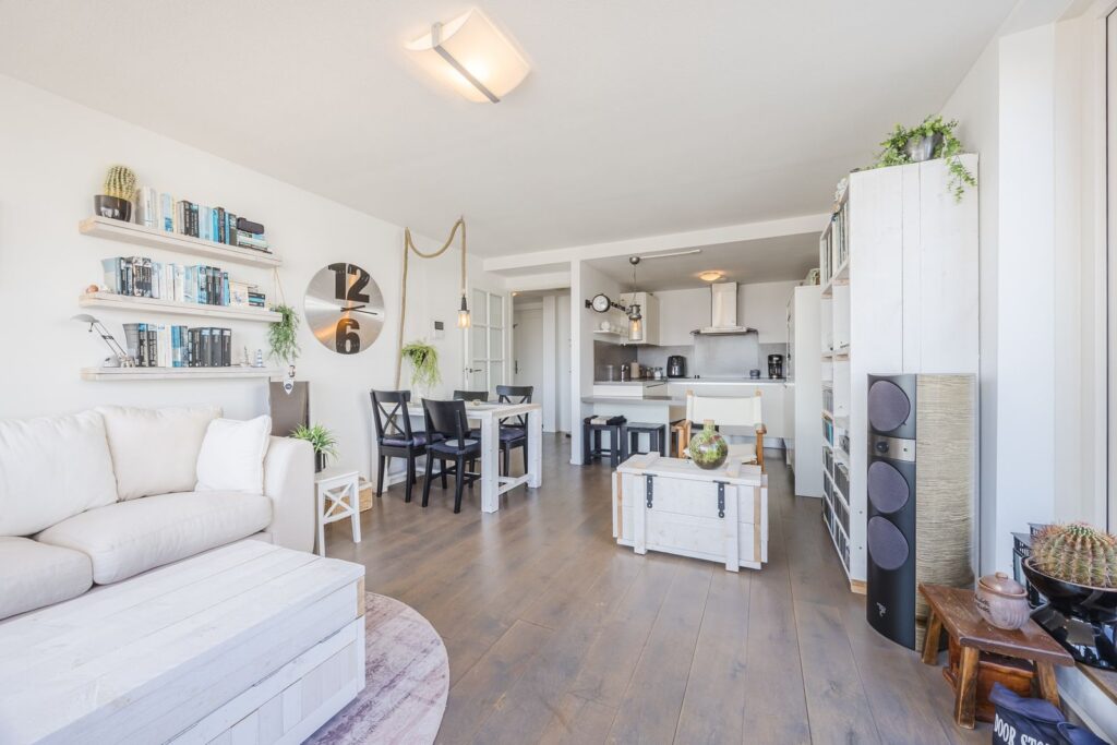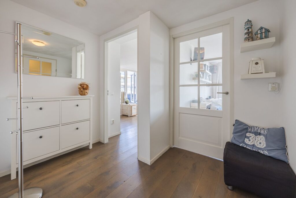 Alle wanden zijn strak afgewerkt en door het gehele appartement ligt een houten vloer. Openslaande deuren vanuit de woonkamer naar het zonneterras met ochtend en middagzon.
