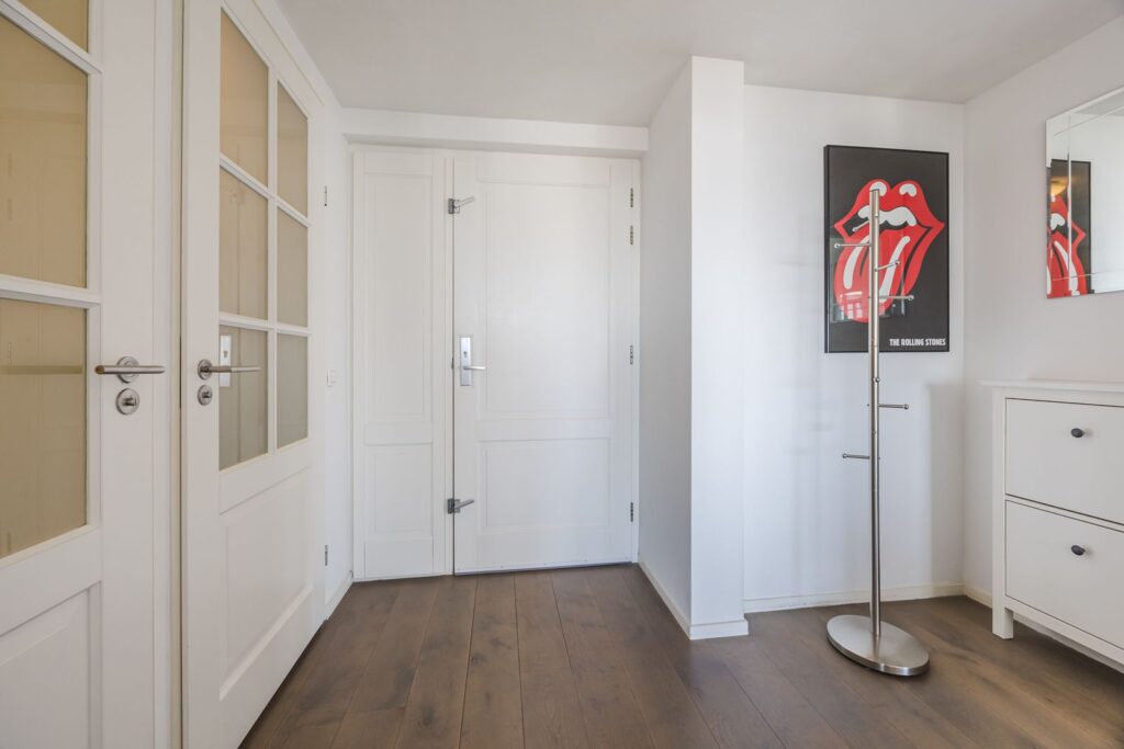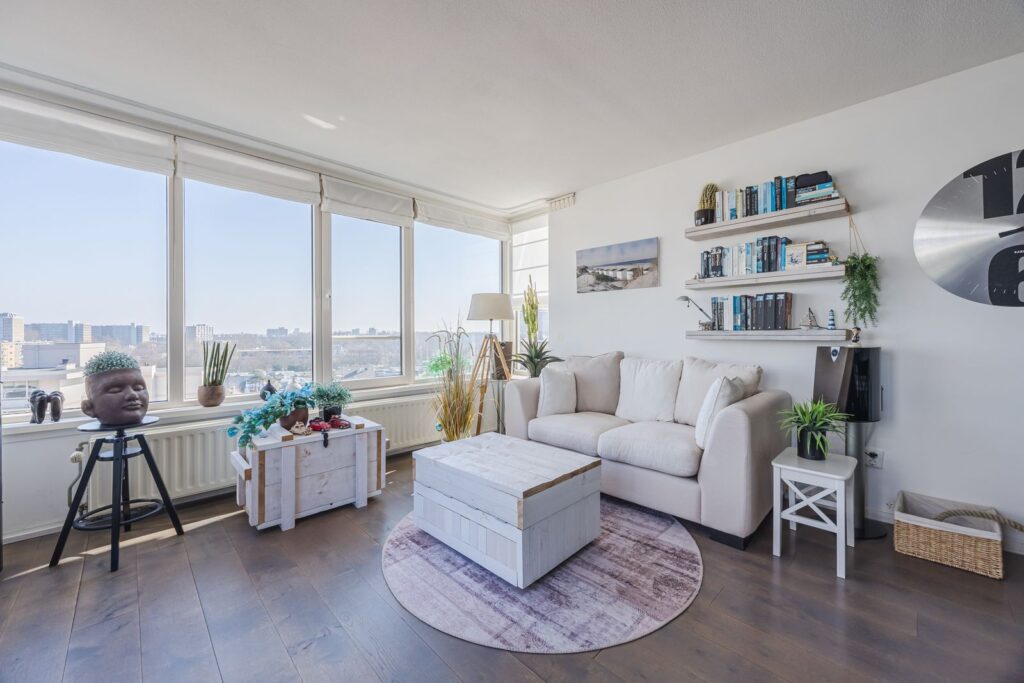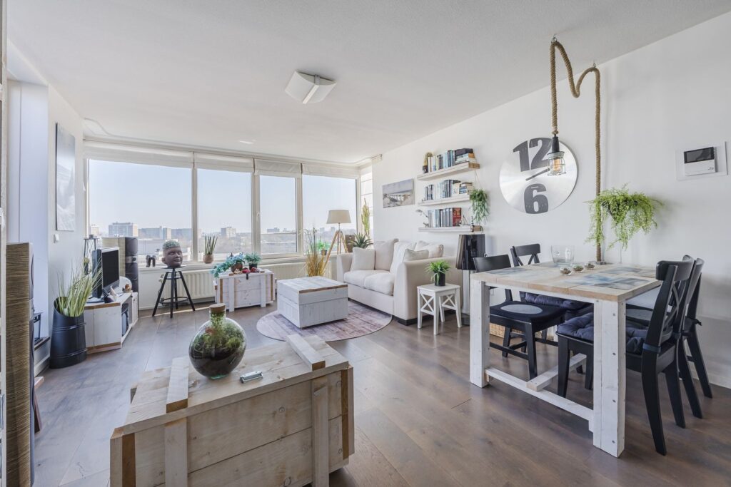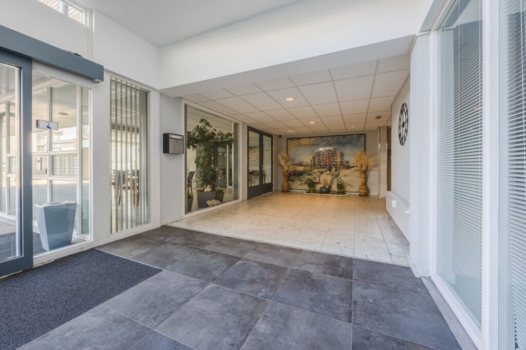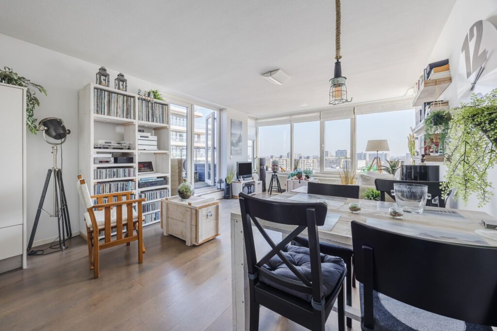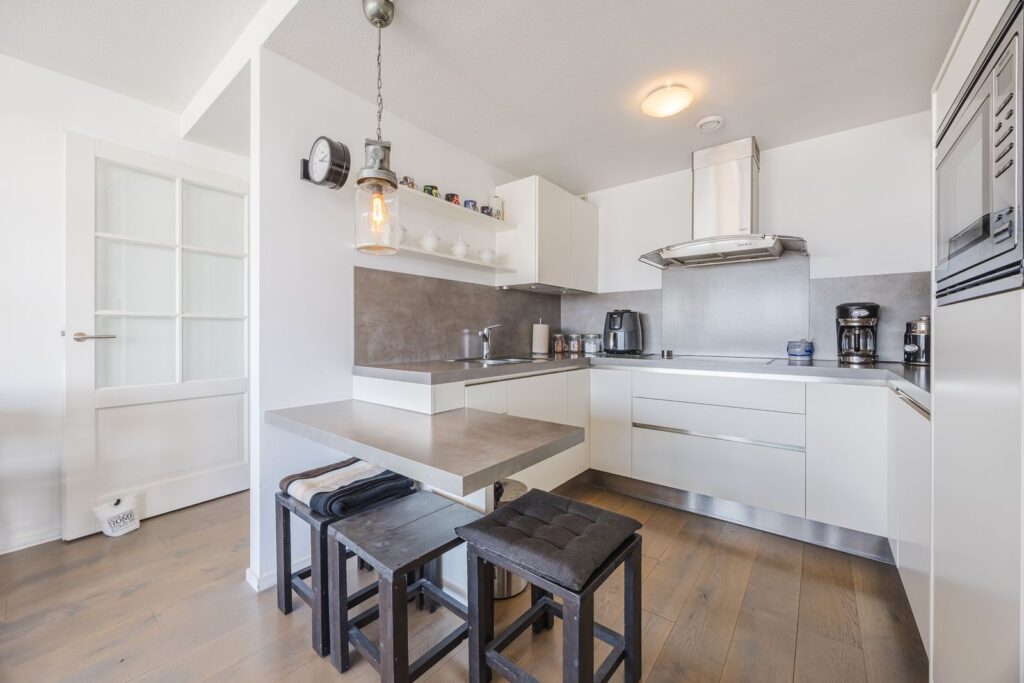 Alle wanden zijn strak afgewerkt en door het gehele appartement ligt een houten vloer. Openslaande deuren vanuit de woonkamer naar het zonneterras met ochtend en middagzon.
