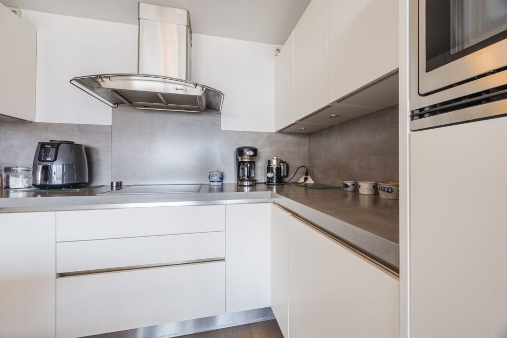 De woonkamer heeft door de grote kozijnen veel lichtinval. De moderne, open keuken is voorzien van alle gewenste inbouwapparatuur (inclusief wasmachine).