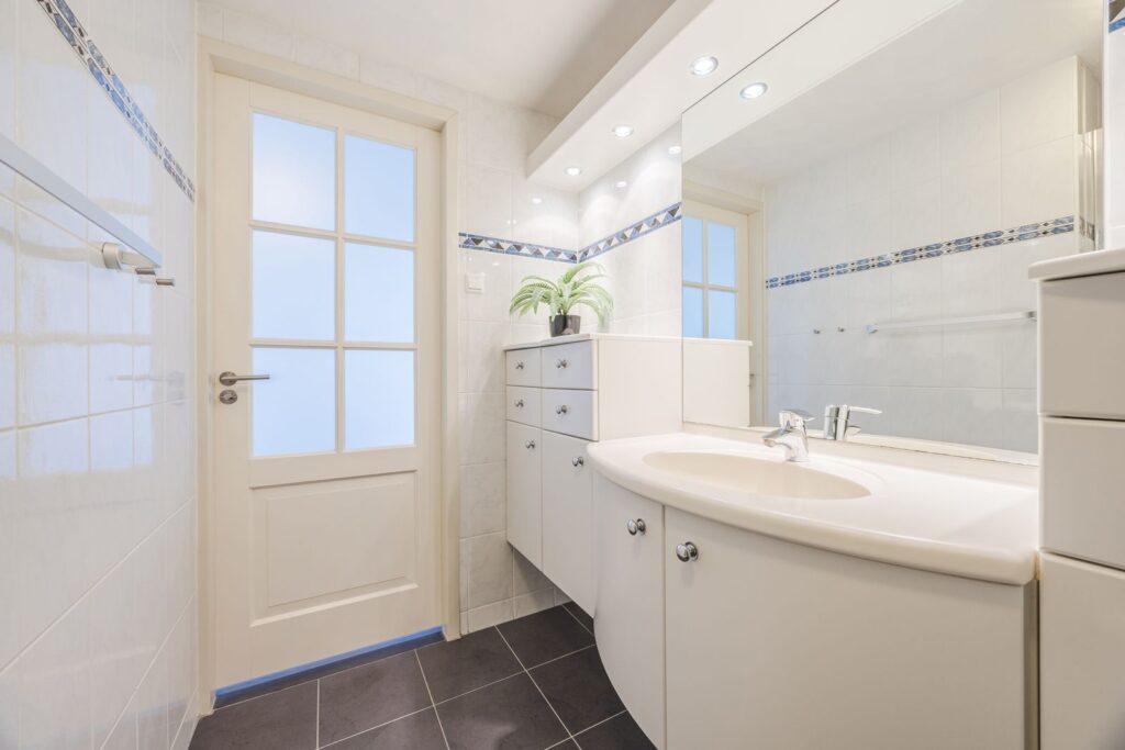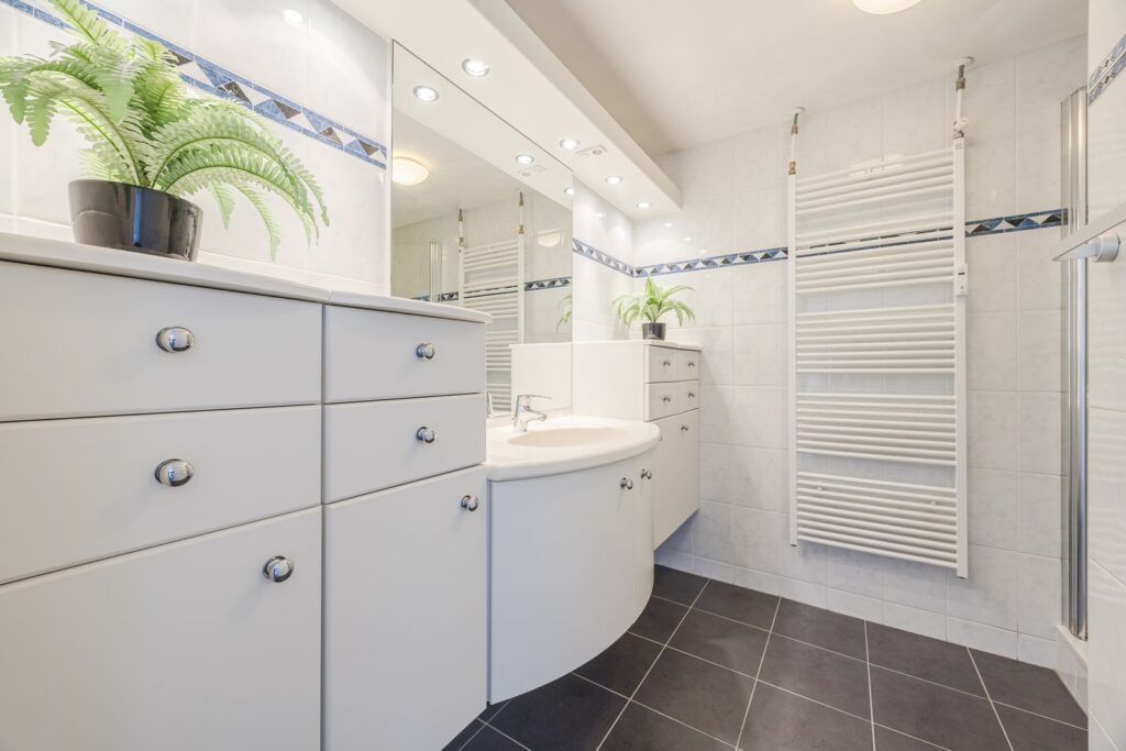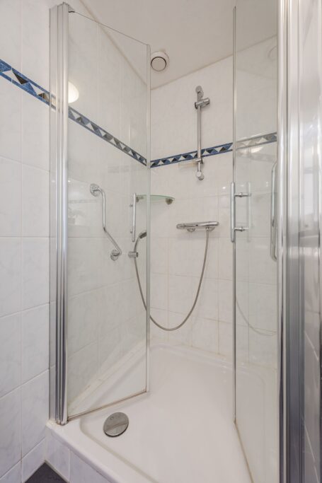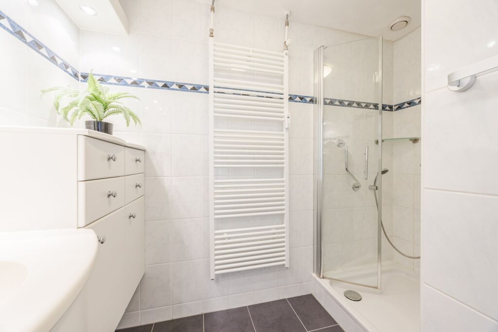 De badkamer is voorzien van een douche, design radiator en wastafelmeubel.
