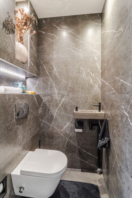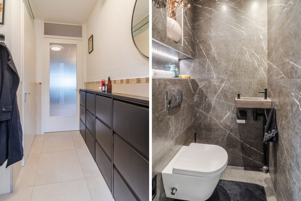 Entree/gang met garderobekast, meterkast, modern toilet met hangcloset en fontein,