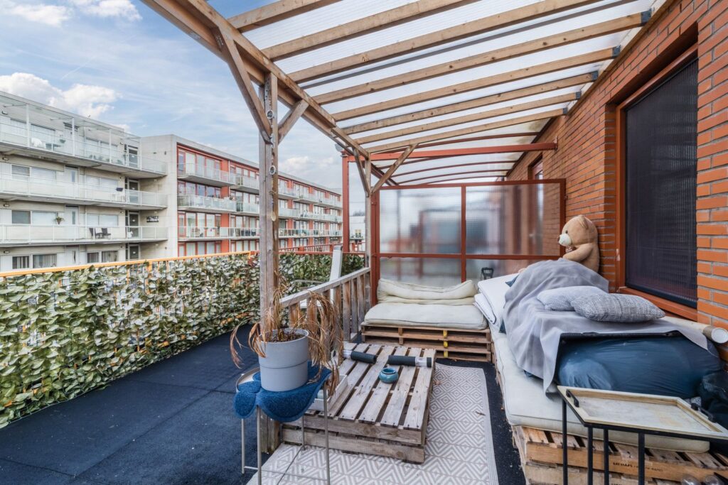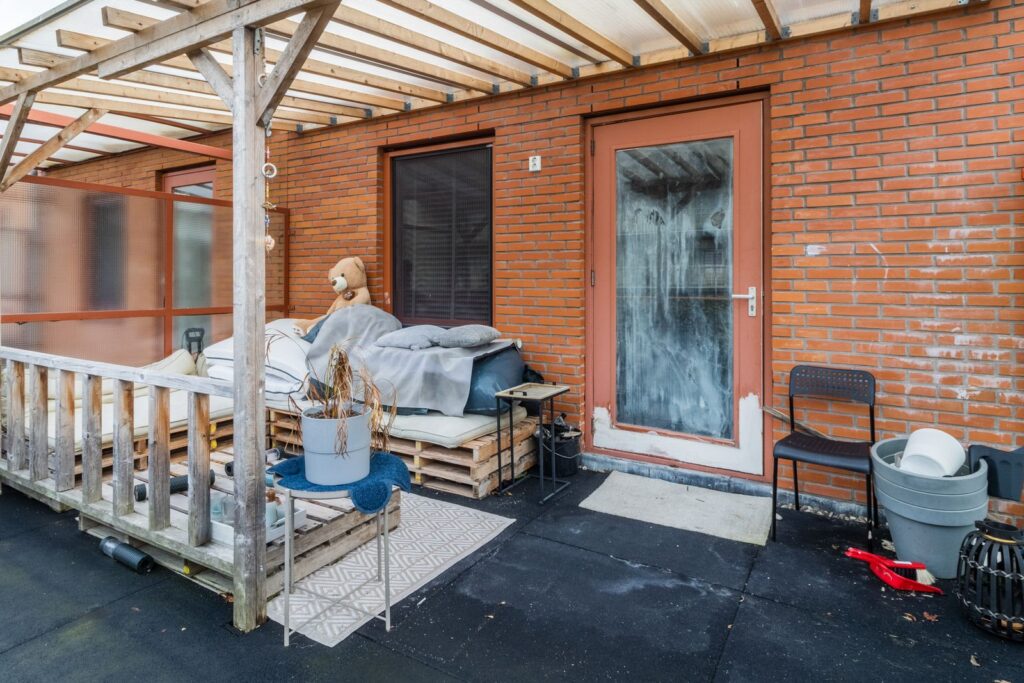Overloop, slaapkamer aan voorzijde (ca. 5.00 x 3.05), slaapkamer aan achterzijde (ca. 2.65 x 2.65), ruim dakterras (ca. 5.00 x 420) met veranda.