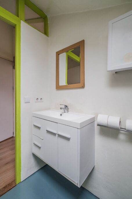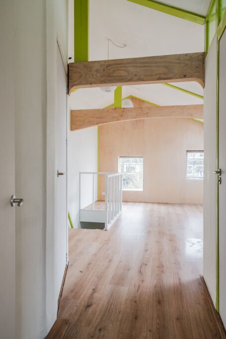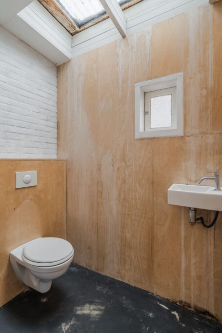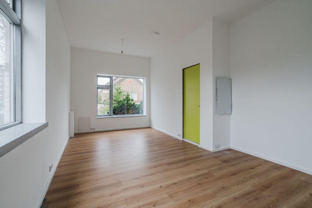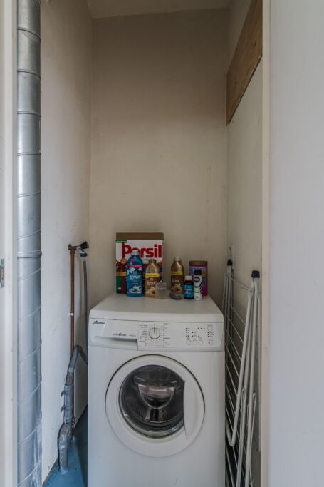 Eerste verdieping: Op de verdieping vindt u een slaapkamer aan de voorzijde met hoog plafond, een tweede slaapkamer is eenvoudig aan de achterzijde in te richten. Dit is nu een open ruimte. De wasapparatuur past in de kast waar de aansluiting aanwezig is en de opstelling van de mechanische ventilatie. De badkamer beschikt over een ligbad, toilet en wastafelmeubel.