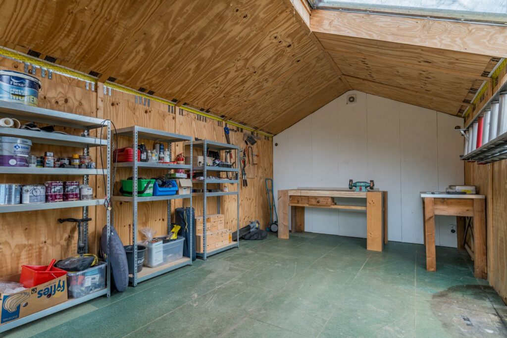 Het moderne bijgebouw (2020) is volledig geïsoleerd en voorzien van elektra, verlichting en ventilatie. Perfect als thuiswerkplek, atelier of hobbyruimte.