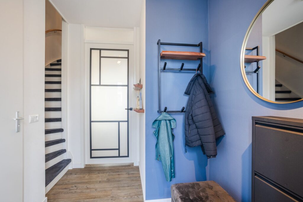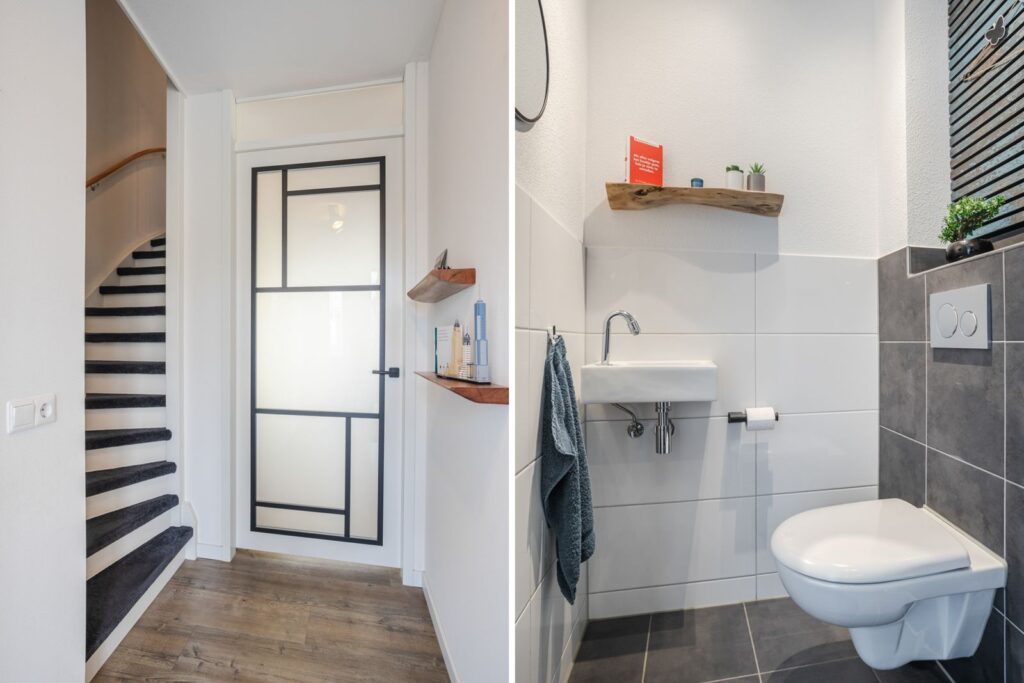 Begane grond: Via de entree kom je in de hal met moderne uitgebreide meterkast, moderne toiletruimte met wandcloset en fonteintje en de trapopgang. De begane grond is volledig voorzien van vloerverwarming.