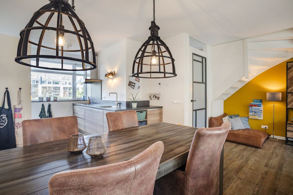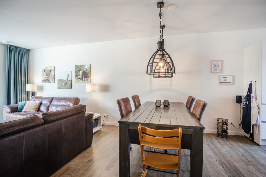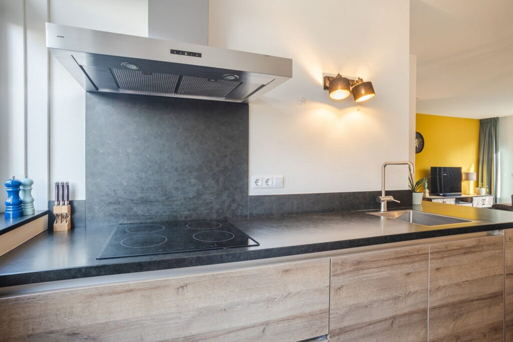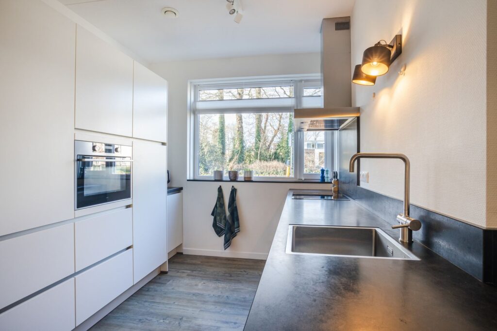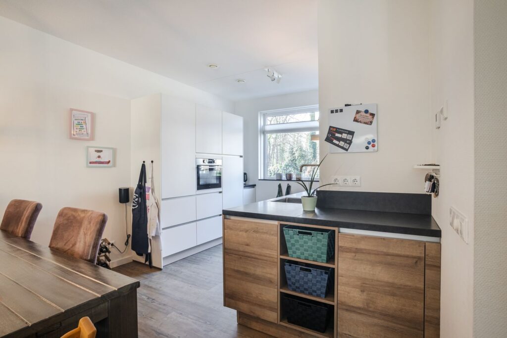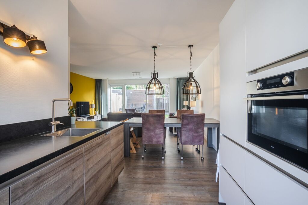 Aan de voorzijde bevindt zich de moderne open keuken, compleet uitgerust met onder andere inductiekookplaat, afzuigkap, combi-oven, koelkast, vriezer en vaatwasser. Een fijne leefruimte waar koken, eten en ontspannen samenkomen.
