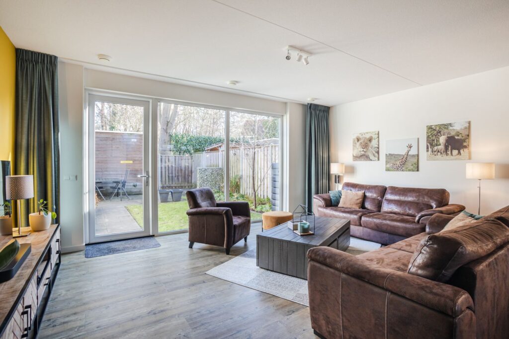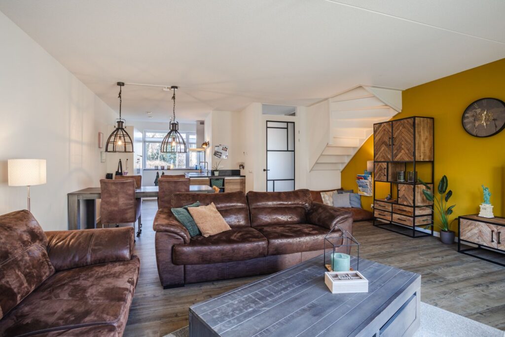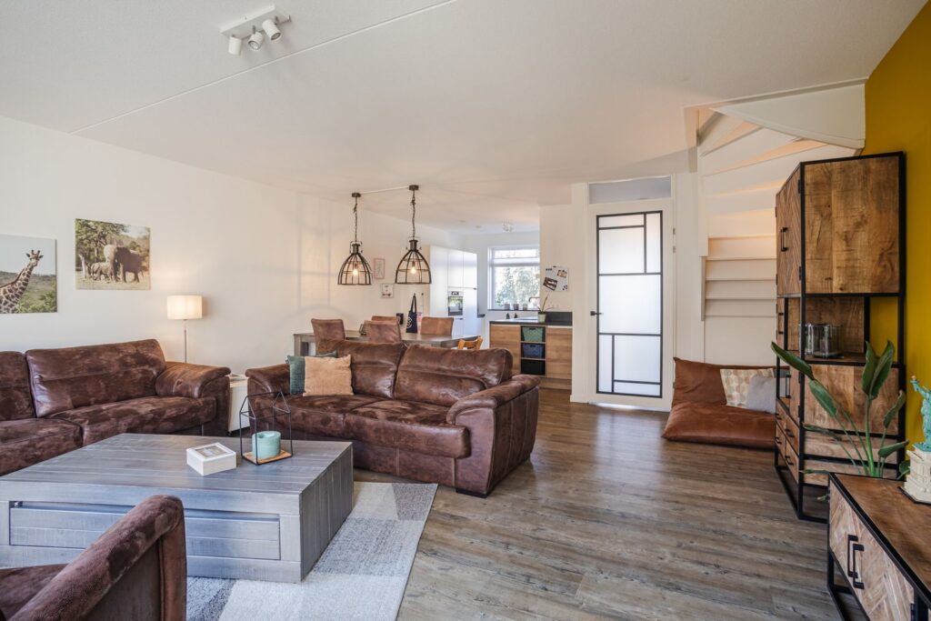 De tuingerichte woonkamer is heerlijk licht en ruim, mede dankzij de 1,20 meter diepe uitbouw en de grote glaspartij tot op de grond aan de achterzijde. De woonkamer staat in open verbinding met de tuin en voelt daardoor extra ruimtelijk aan.