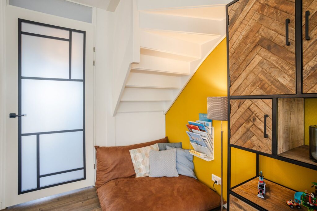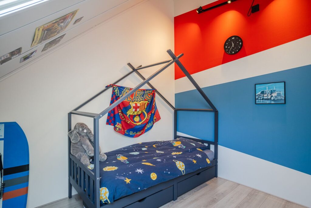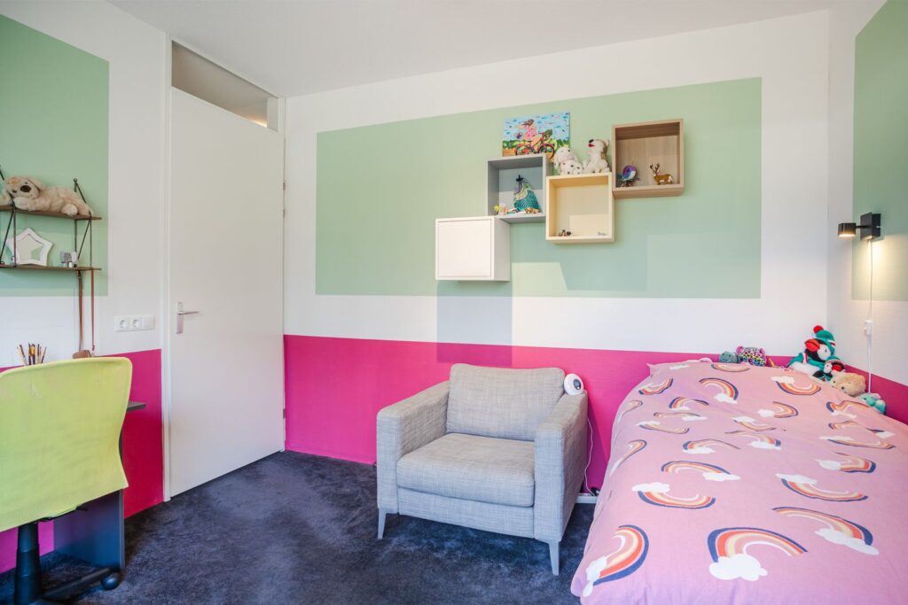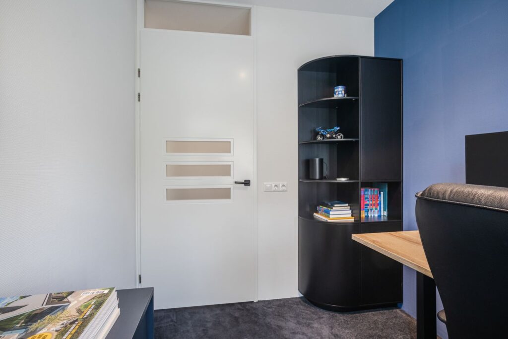 Eerste verdieping: Op deze verdieping bevinden zich drie slaapkamers, waaronder een ruime hoofdslaapkamer aan de achterzijde. De kamers zijn praktisch ingedeeld en bieden volop mogelijkheden voor slapen, werken of hobby’s. De badkamer is strak en comfortabel uitgevoerd met: inloopdouche, wandcloset, wastafelmeubel en elektrische vloerverwarming.