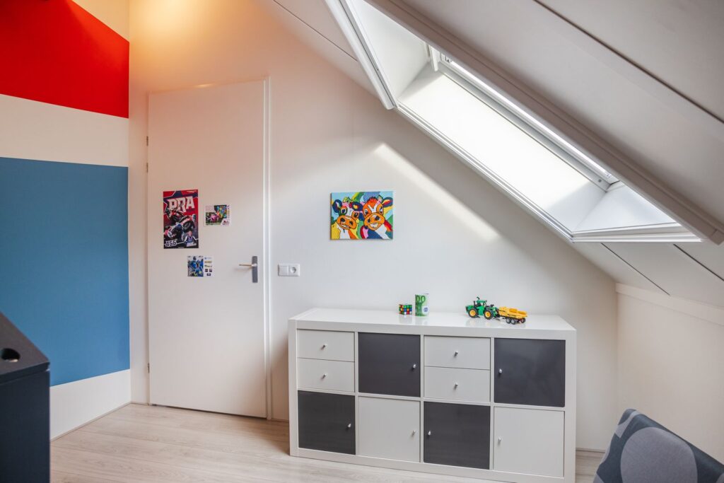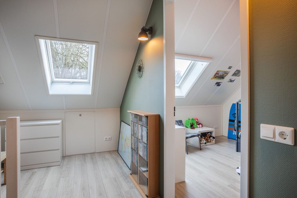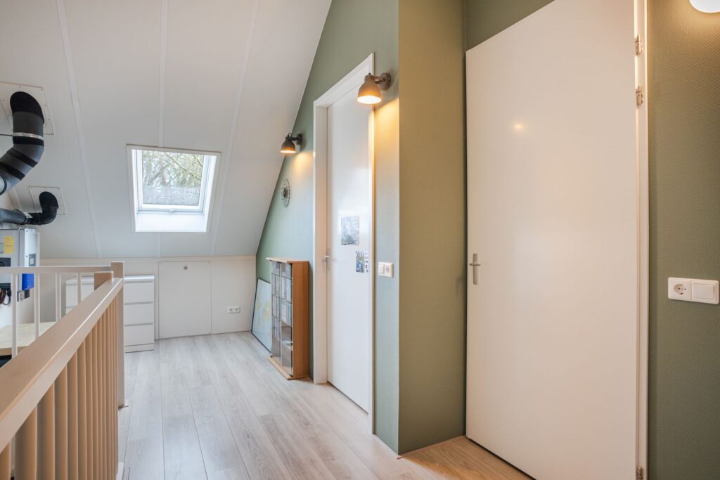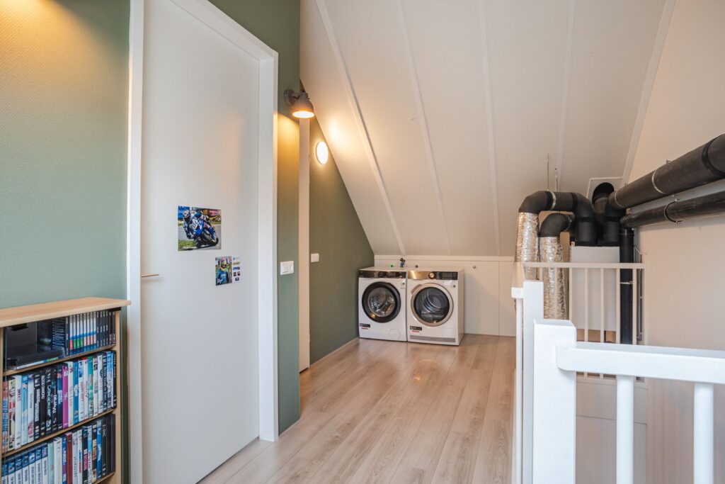 Tweede verdieping (zolder): Via een vaste trap bereik je de verrassend ruime zolderverdieping. Hier bevindt zich een ruime voorzolder met aansluiting voor de wasapparatuur en opstelling WTW-installatie (Brink Renovent Excellent). Verder een vierde slaapkamer met een Velux dakraam en een ruime berging.