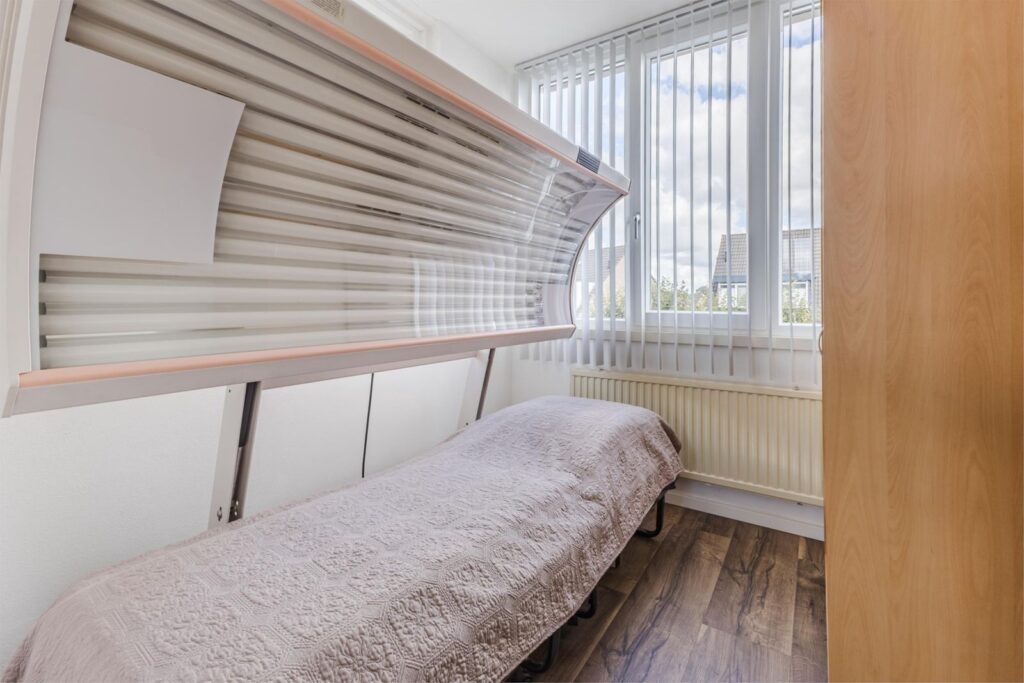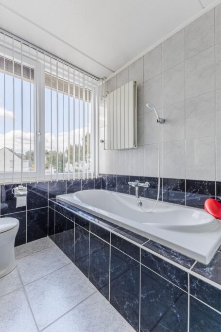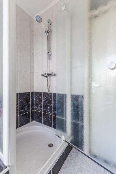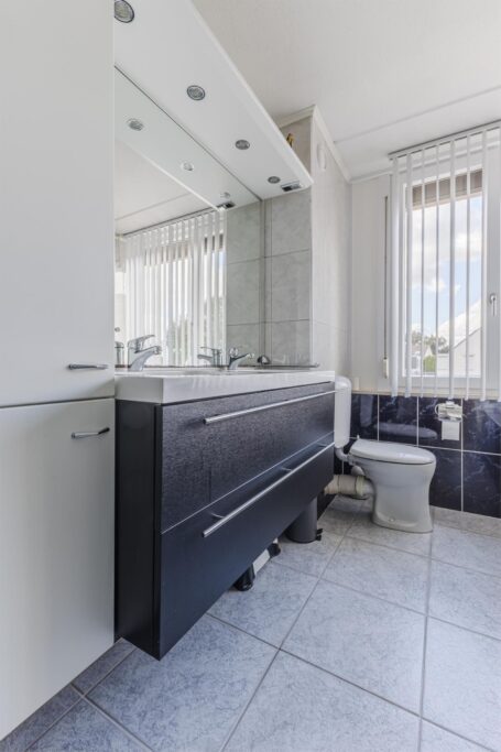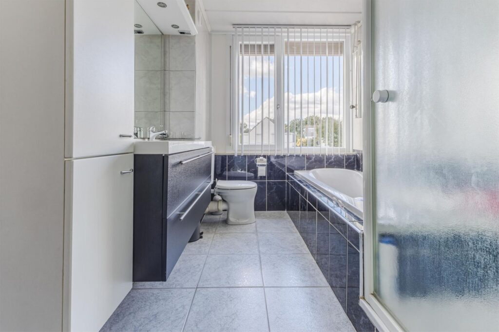 Aan de overloop grenzen drie slaapkamers en de badkamer. De hoofdslaapkamer is gelegen aan de voorzijde van de woning. De tweede slaapkamer ligt aan de achterzijde van de woning en heeft een leuk uitzicht op de tuin, de derde slaapkamer ligt eveneens aan de achterzijde en heeft een extra zijraam. Op de slaapkamers en op de overloop ligt een laminaatvloer. De volledig betegelde badkamer heeft een douche, ligbad, een royale meubel met dubbele wastafels met kast en een toilet.