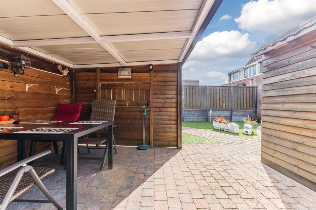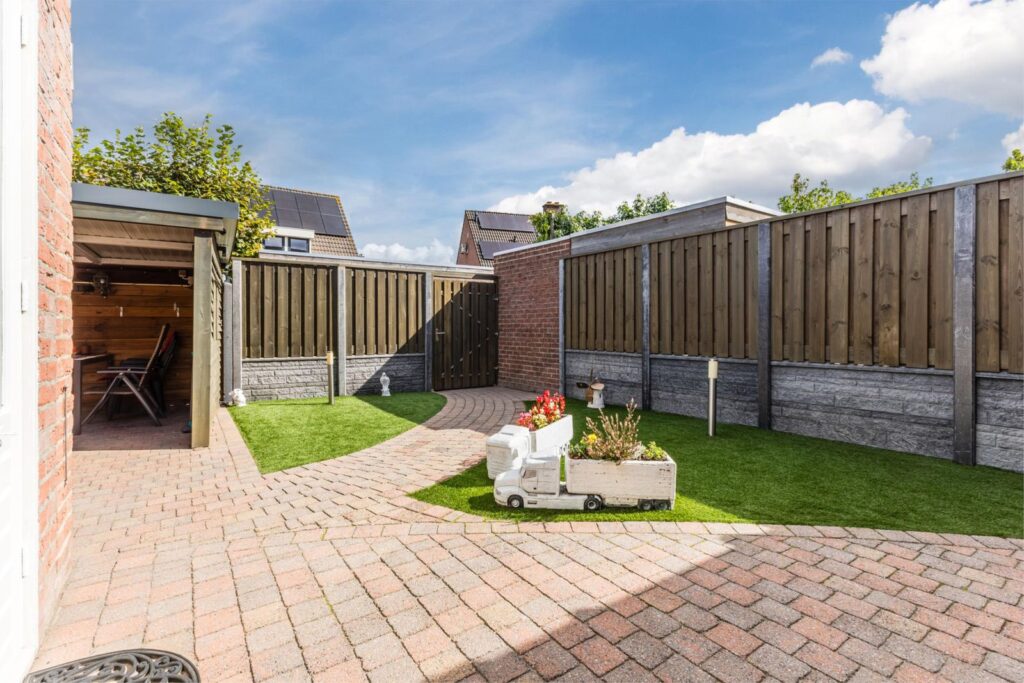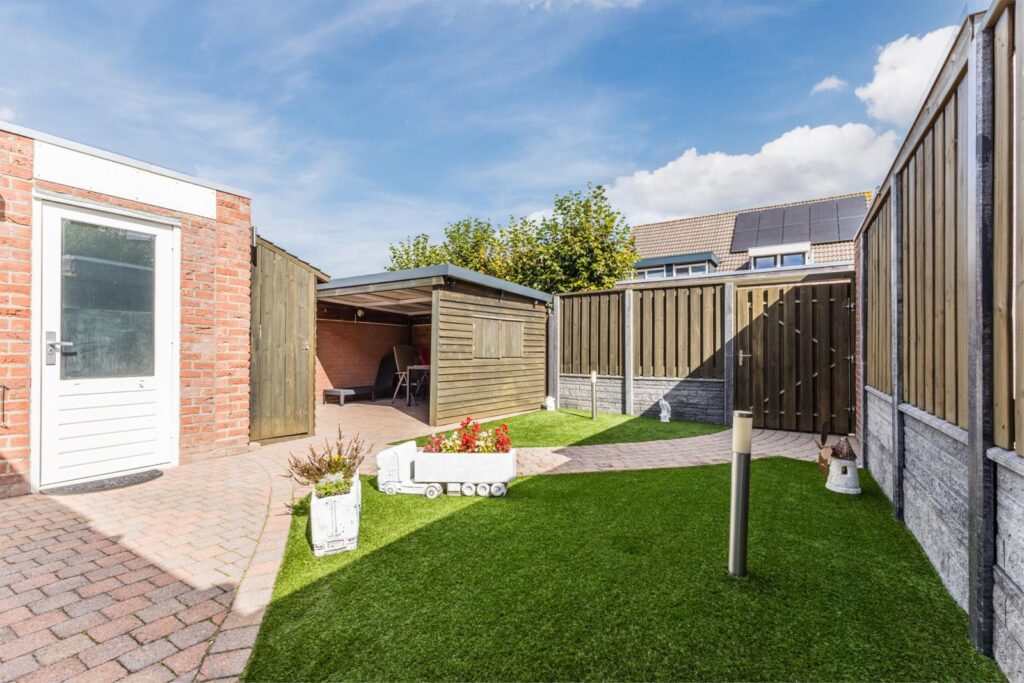 - Onderhoudsarme tuin met vrije achterom, overkapping, tuinhuisje en berging