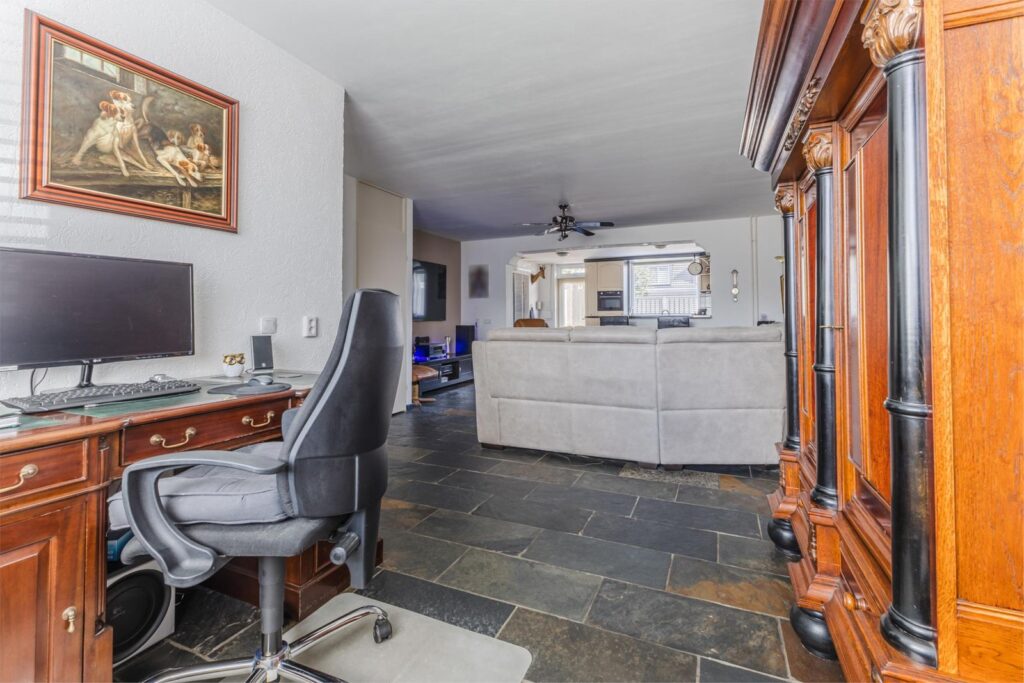 Via de royale oprit waar ruimte is voor 3 auto's, komt u bij de voordeur en de hal. In de hal treft u de meterkast, trap naar de eerste verdieping en de toiletruimte aan. De toiletruimte is deels betegeld en heeft een toilet met fonteintje. Via de deur komt u in het leefgedeelte terecht. Aan de voorzijde is een werkhoek gemaakt die uiteraard ook goed kan worden gebruikt als speelruimte of een hobbyruimte. Het zitgedeelte ligt centraal in de woonruimte en is ruim van opzet. Aan de achterzijde van de woning is de complete keuken met een zes persoons bartafel. De keuken is royaal opgezet en voorzien van veel werk en bergruimte. Hier treft u onder andere: inductiekookplaat met in afzuiginstallatie, dubbele spoelbak, combi-oven, koelkast, vaatwasser (Bosch), wasmachine (Miele) en droger (Miele). Zowel het aanrecht en bartafel hebben een luxe granietstenen afwerking. De ruimte is afgewerkt met een leistenen vloer en is voorzien van comfortabele vloerverwarming over de gehele begane grond. Via de deur komt u in een trappenkast terecht. Hier is ruimte voor het plaatsen van een stofzuiger en diverse voorraden. Vanuit de keuken kunt u naar de ruime, bijna 10 meter diepe inpandige garage. Deze ruimte heeft een elektrische garagedeur en een kelder opslagruimte. Ondanks de grote uitbouw is er nog steeds voldoende diepte over in de tuin. De tuin is onderhoudsarm aangelegd, er is een tuinhuisje, een stenen berging, een vrije achterom en een overdekt terras aan de achterzijde.