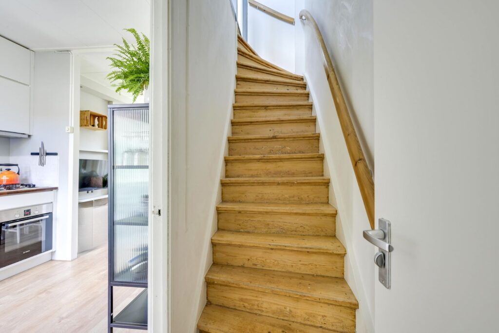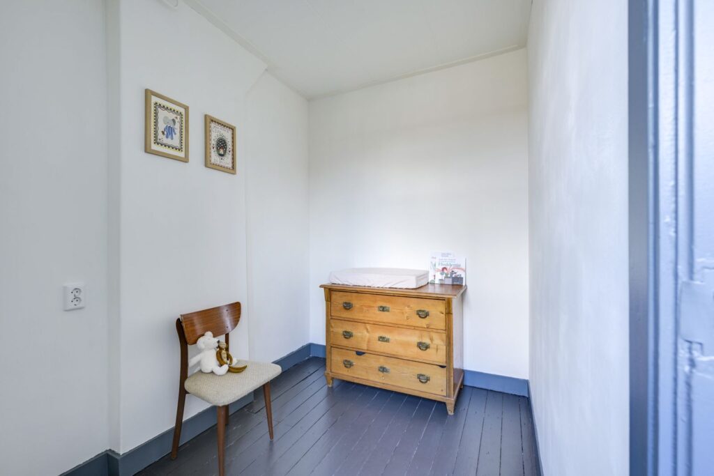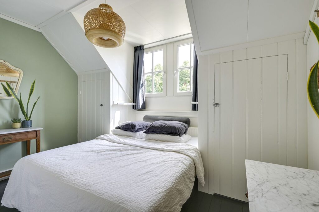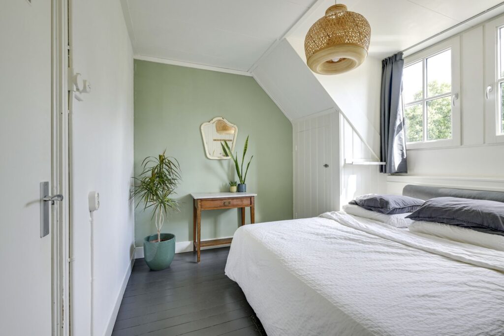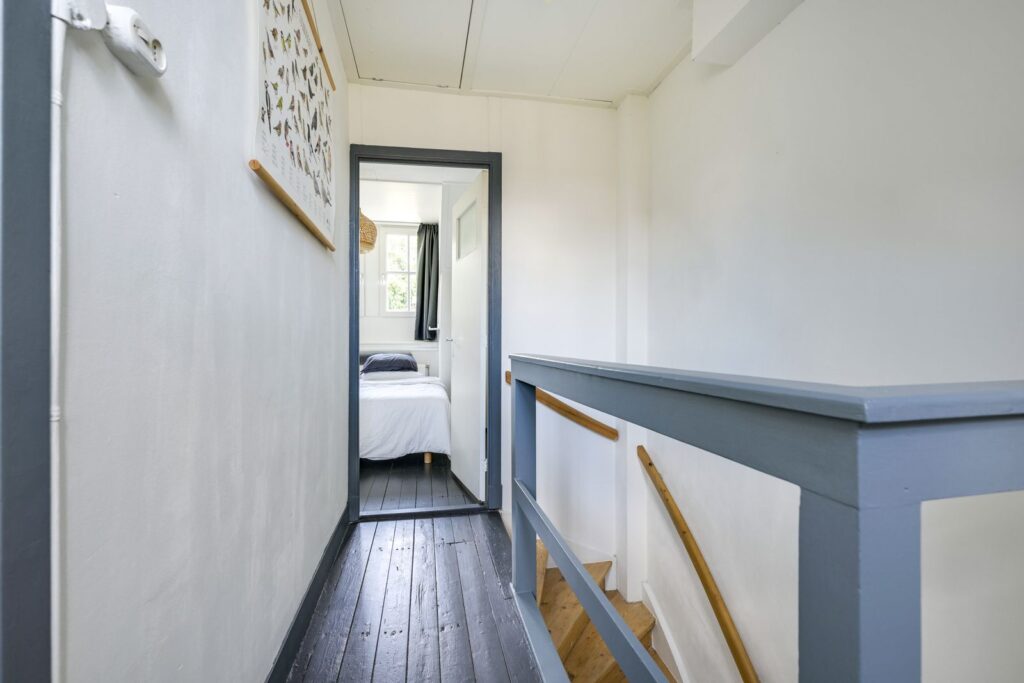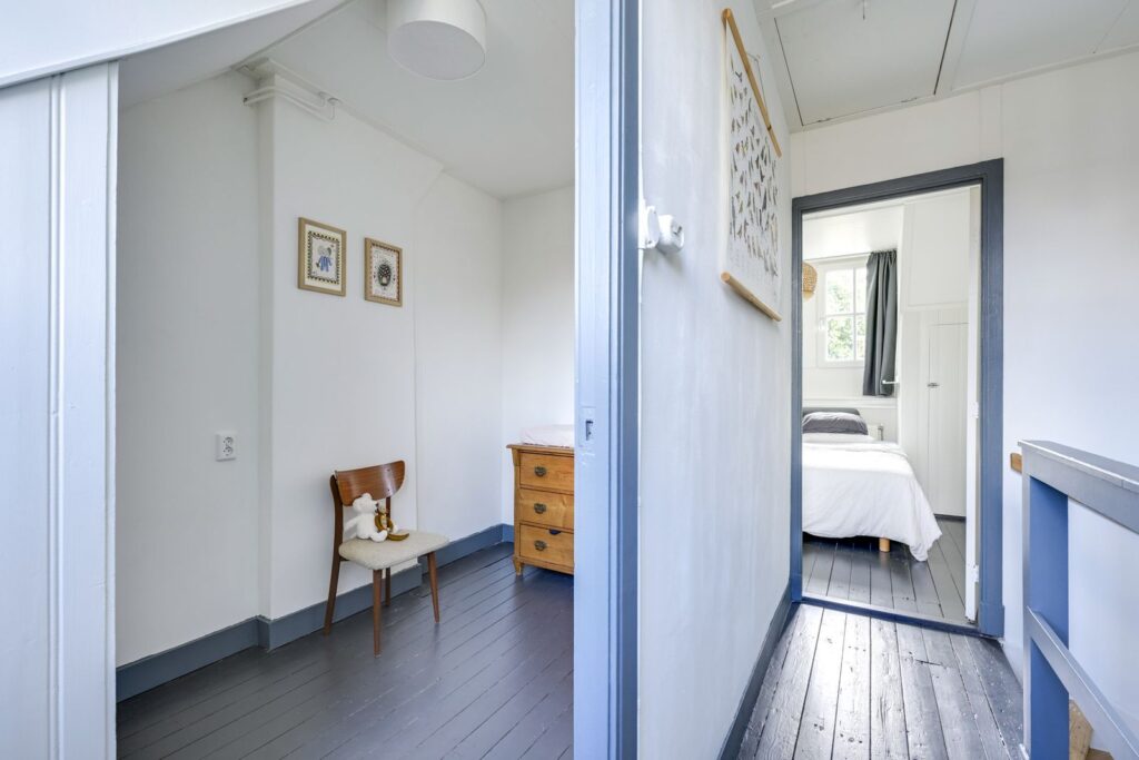 The staircase leads to the landing, which provides access to two bedrooms. The front bedroom is spacious, includes two built-in wardrobes, and offers views over the greenery. The rear bedroom has a built-in wardrobe and is ideal as a child’s room, home office, or guest room. Both bedrooms feature characteristic dormer windows. There is also a generous attic storage space for extra belongings.