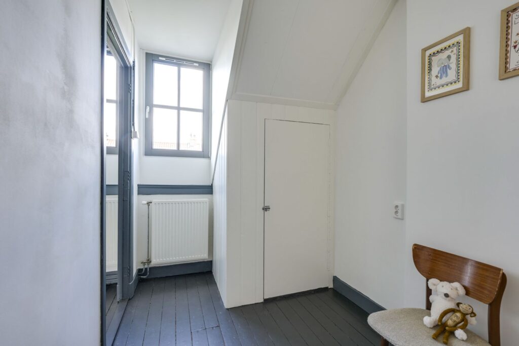 Via de trap kom je op de overloop, met toegang tot twee slaapkamers. De slaapkamer aan de voorzijde is lekker ruim, heeft twee inbouwkasten en kijkt uit op het groen. De kamer aan de achterzijde beschikt over een inbouwkast en is perfect als kinderkamer, werkkamer of logeerkamer. Beide kamers zijn voorzien van karakteristieke dakkapellen. Er is bovendien een ruime bergvliering aanwezig voor extra opbergruimte.