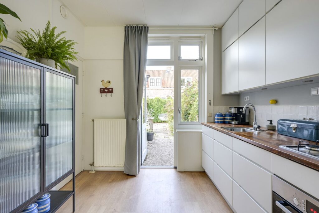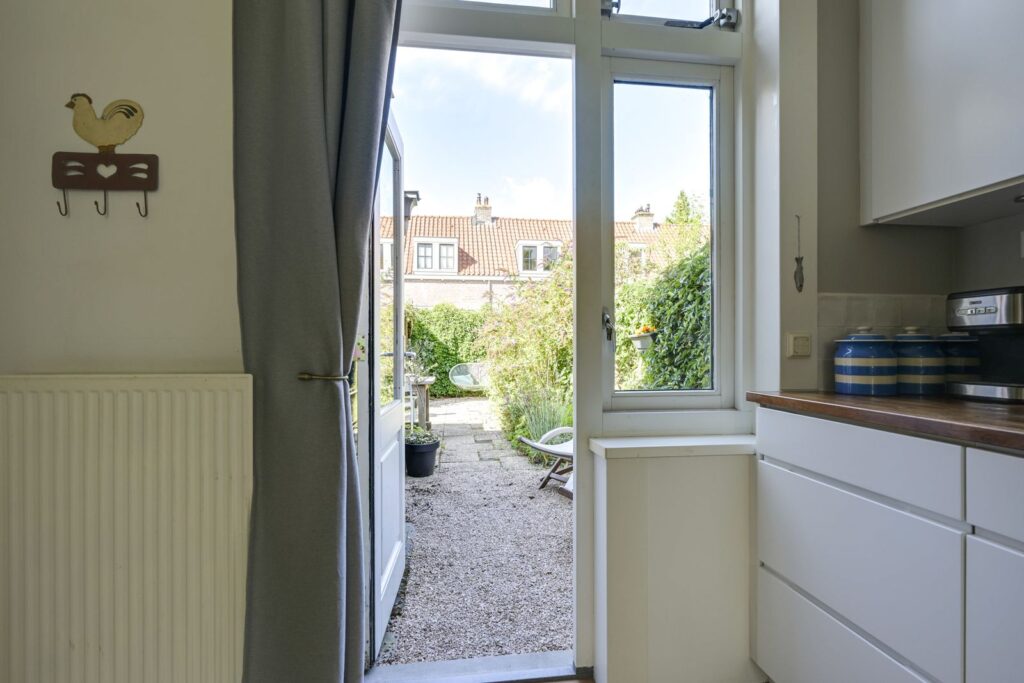 Je komt via de voortuin binnen in de hal, met toegang tot de woonkamer. De woonkamer is knus en licht en heeft een deur naar de achtertuin, ideaal voor zomerse dagen. De open keuken is vernieuwd in 2017 en voorzien van alle gemakken: een 4-pits gasfornuis, afzuigkap, oven, vaatwasser en koelkast. Achter de keuken bevindt zich de badkamer met ligbad/douchecombinatie, toilet, wastafelmeubel, wasmachineaansluiting en designradiator. Vanuit de keuken heb je toegang tot de heerlijke tuin op het zuidwesten met vrijstaande berging.
