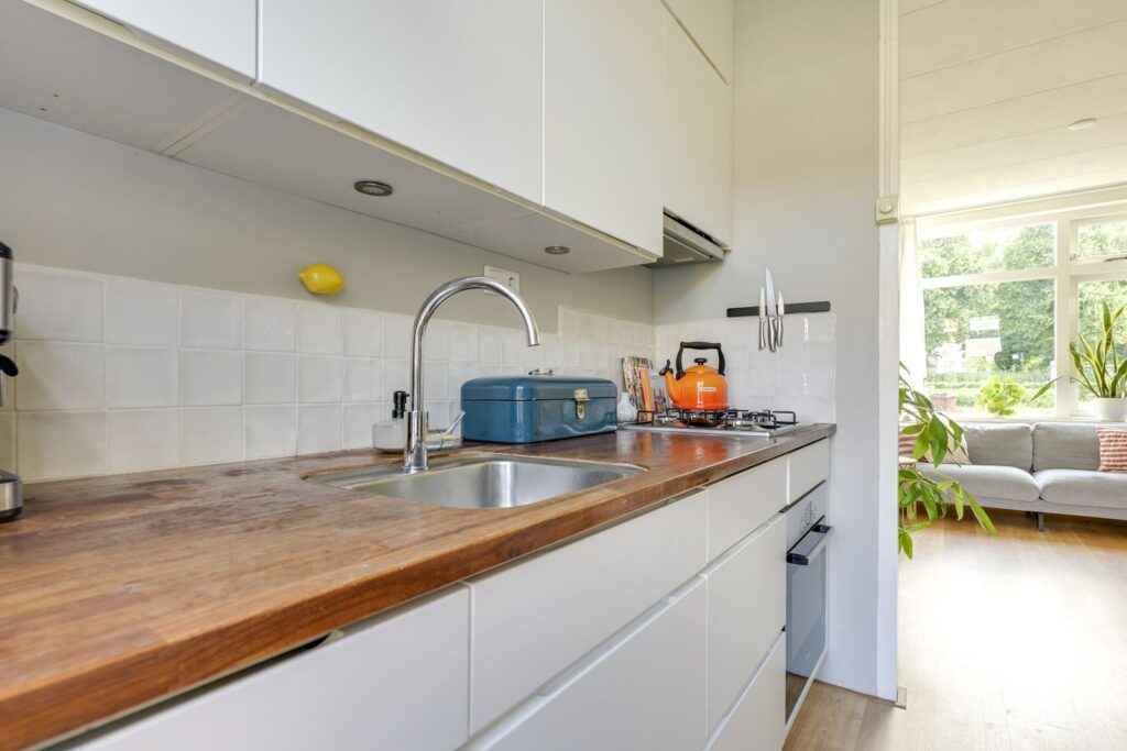 You enter the home through the front garden into the hallway, which provides access to the living room. The living room is cozy and bright and has a door leading to the backyard—perfect for summer days. The open kitchen was renovated in 2017 and is fully equipped with a 4-burner gas hob, extractor hood, oven, dishwasher, and refrigerator. Behind the kitchen is the bathroom, featuring a bathtub/shower combination, toilet, washbasin with vanity unit, washing machine connection, and designer radiator. From the kitchen, you also have access to the lovely southwest-facing garden with a detached storage shed.