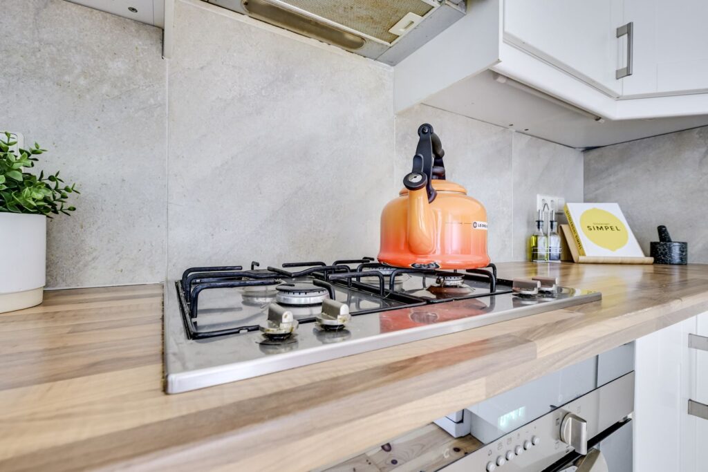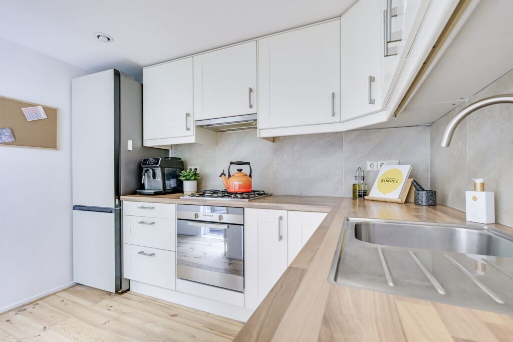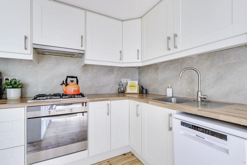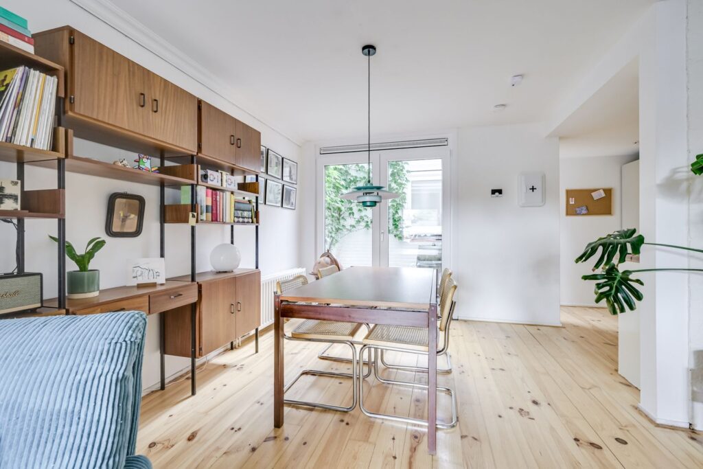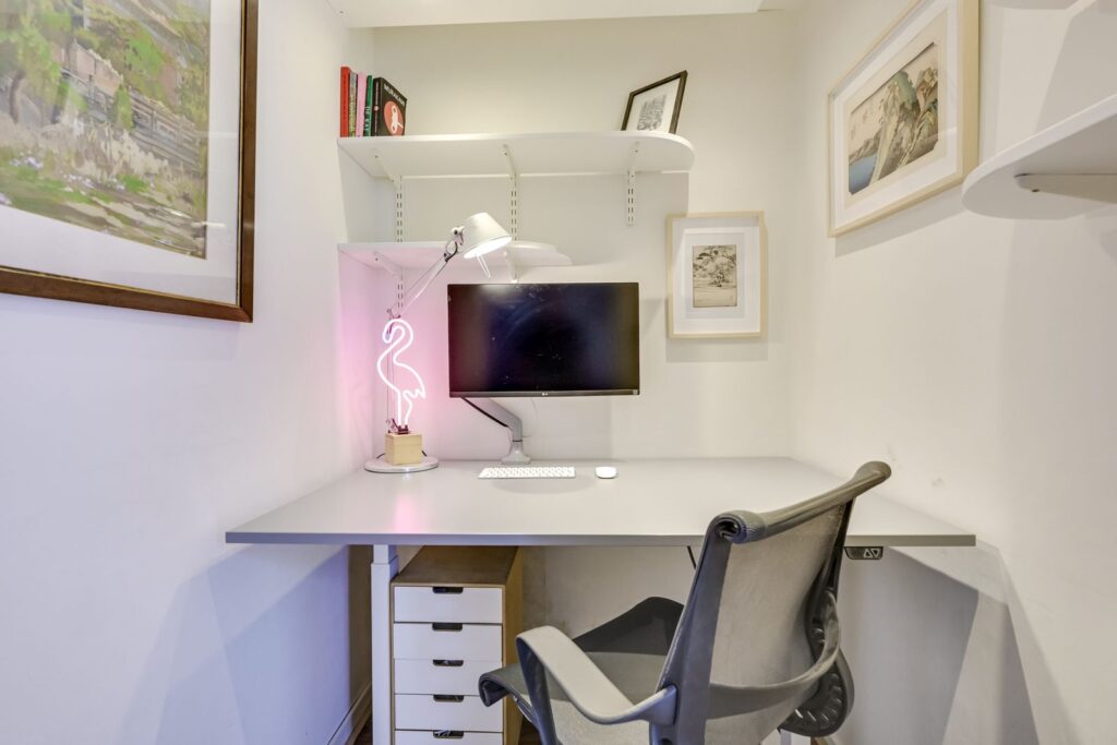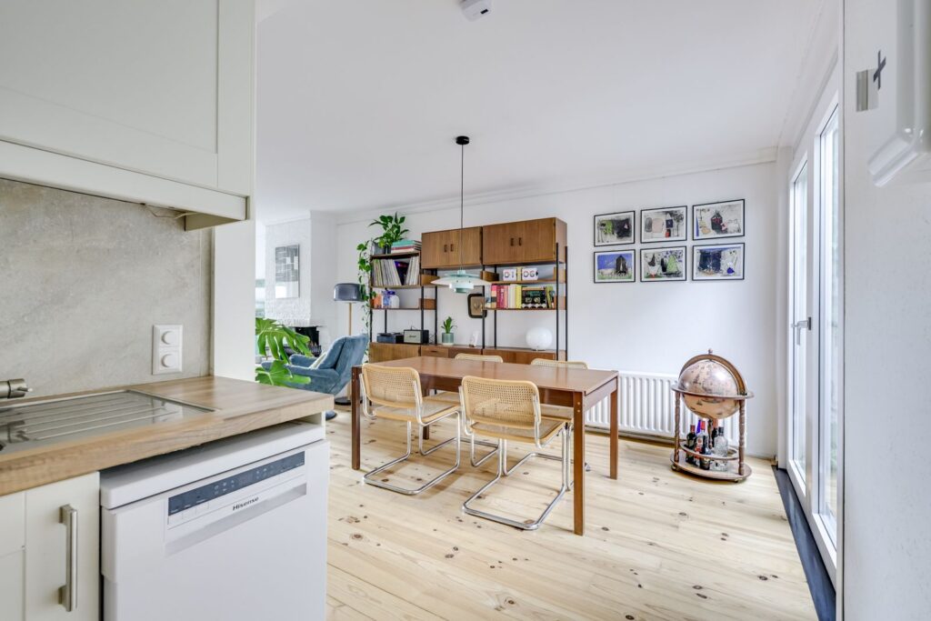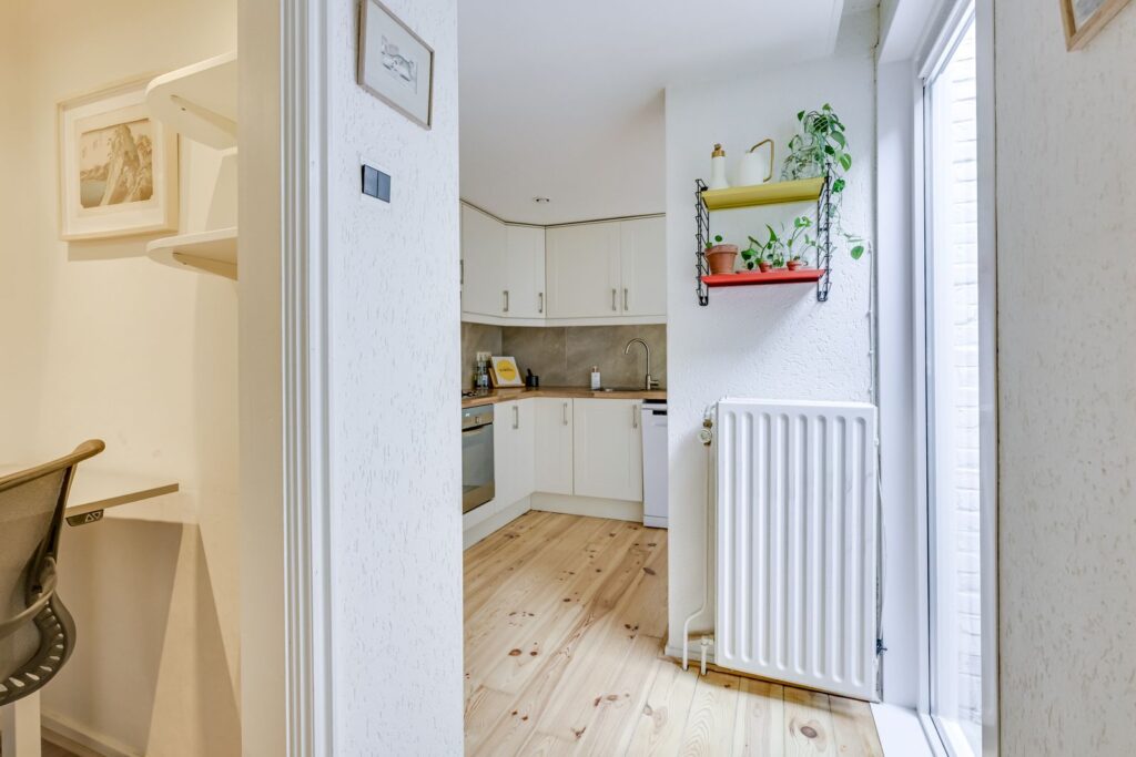 The kitchen is equipped with a corner layout offering plenty of storage space and various built-in appliances: a gas stove with extractor hood, oven, and dishwasher. From the kitchen, you continue to the back of the property, where you’ll find a separate study (ideal for working from home), a bedroom overlooking the second patio, and the bathroom.