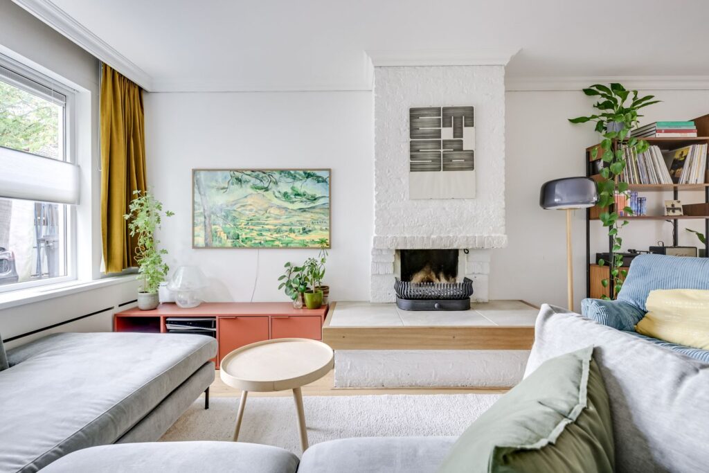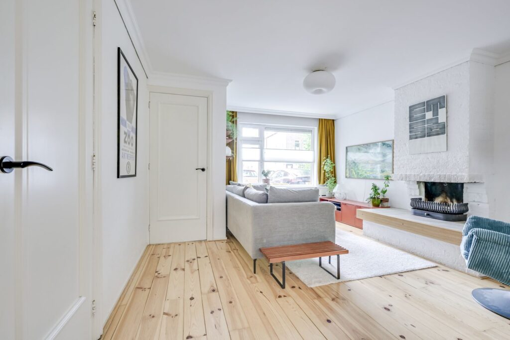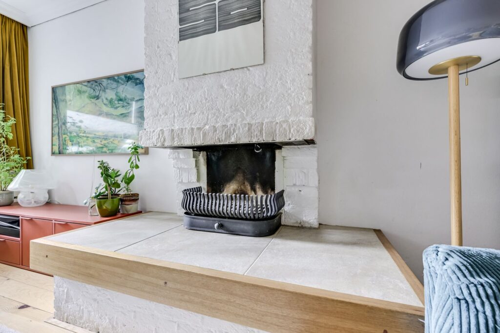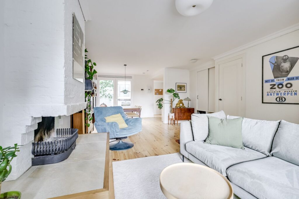 V Verrassend lichte woonkamer met sfeervolle open haard